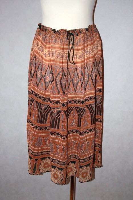 wzorzysta, zwiewna, cienka, prześwitująca spódnica (wg mnie raczej plażowa) w stylu etno, mocno marszczona, w pasie gumka, ściągana sznureczkiem, brak metki ze składem i rozmiarem