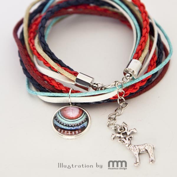 Bransoletka z możliwością noszenia jako naszyjnik, to bardzo romantyczne, nostalgiczne i kobiece malutkie dzieło sztuki. Obrazek pod szkiełkiem to autorska ilustracja indiańskiego etno wzoru. Bransoletka z kilku rzemieni w kolorze czerwonym,bieli, granatu i seledynu prezentuje się wspaniale, a zawieszka oraz medalion z jelonkiem dopełniają romantyczną stylistykę .