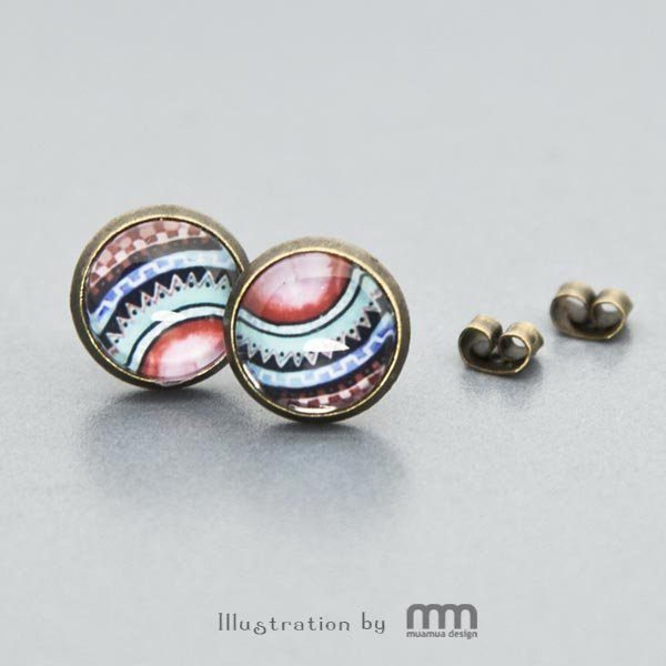 Kolczyki z autorską ilustracją etnicznego wzorku łączą nowoczesność z odrobiną antycznego powiewu. Ilustracja jest zatopiona pod szkiełkiem. Piękna kolorystyka przyciągająca każde spojrzenie! Hit na lato!