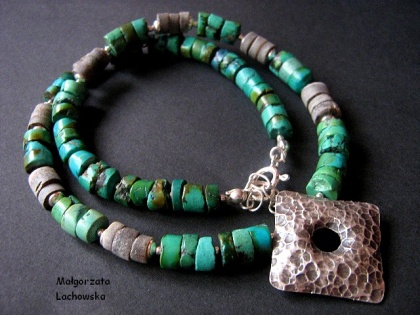 Naszyjnik w etnicznym stylu , wykonany z krążków turkusu i muszli szerej oraz srebra próby 925. Długość naszyjnika wynosi 40 cm plus regulacja, długość boku medalionu -22 mm.