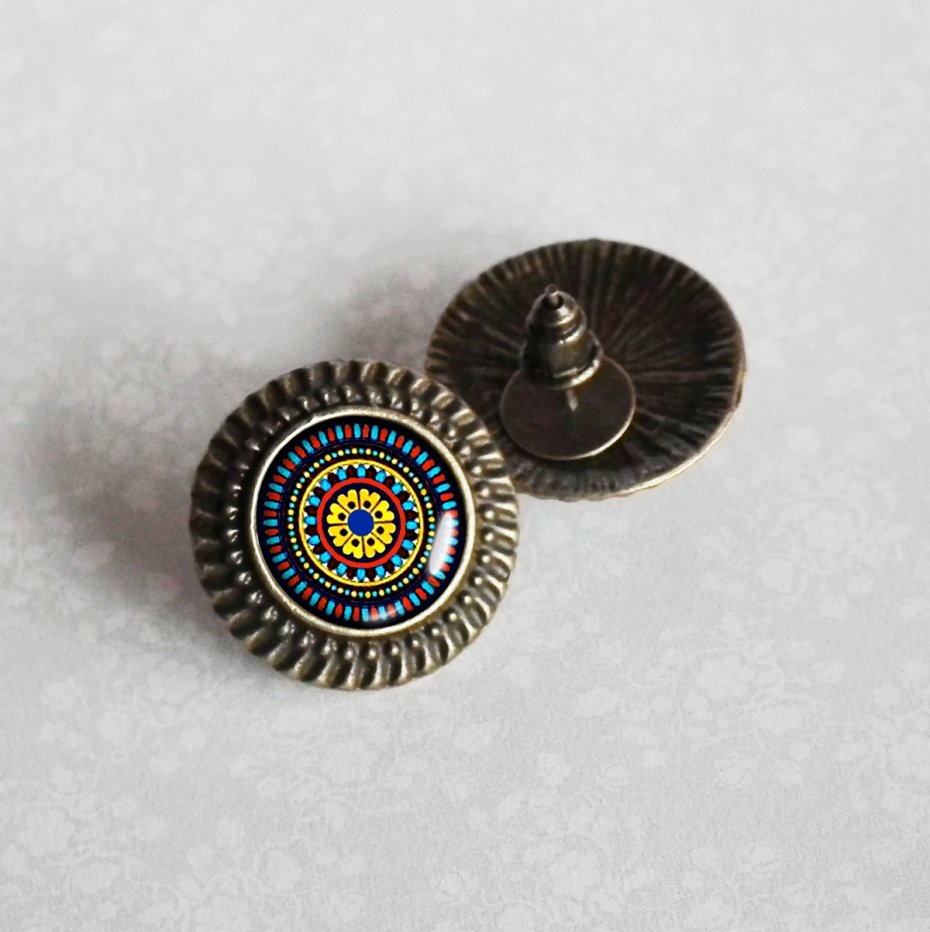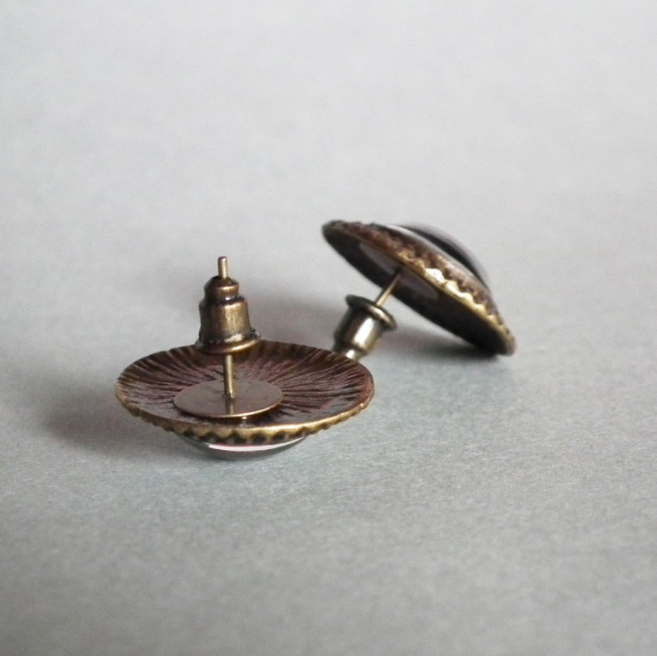 Kolczyki na sztyfcie ( wkrętki) z oryginalną grafiką, zatopioną pod wypukłym szkiełkiem i oprawioną w hipoalergiczną bazę w kolorze antycznego brązu. Grafika jest najwyższej jakości, wyraźna i nasycona. Oryginalne kaboszony wykonane ręcznie według mojego projektu i przeze mnie, z dbałością o każdy detal. Biżuteria bez niklu i ołowiu.