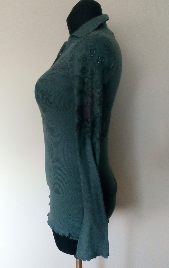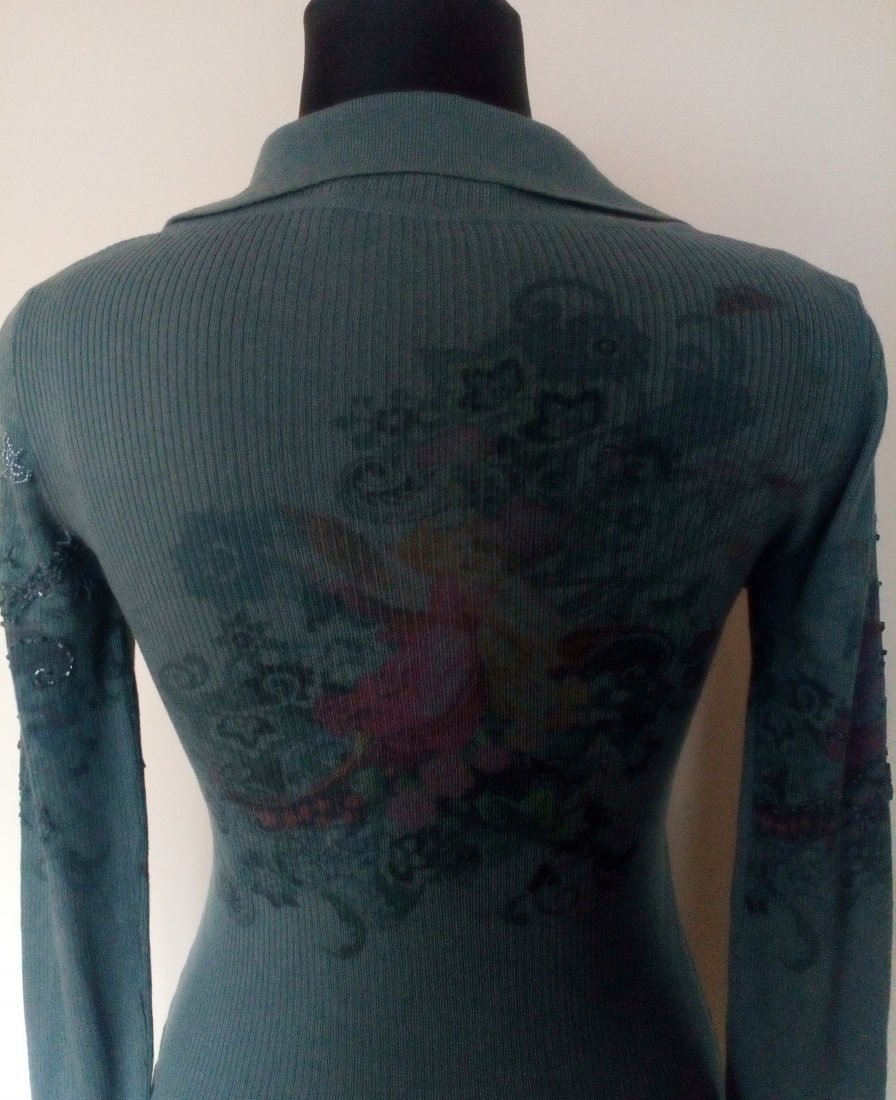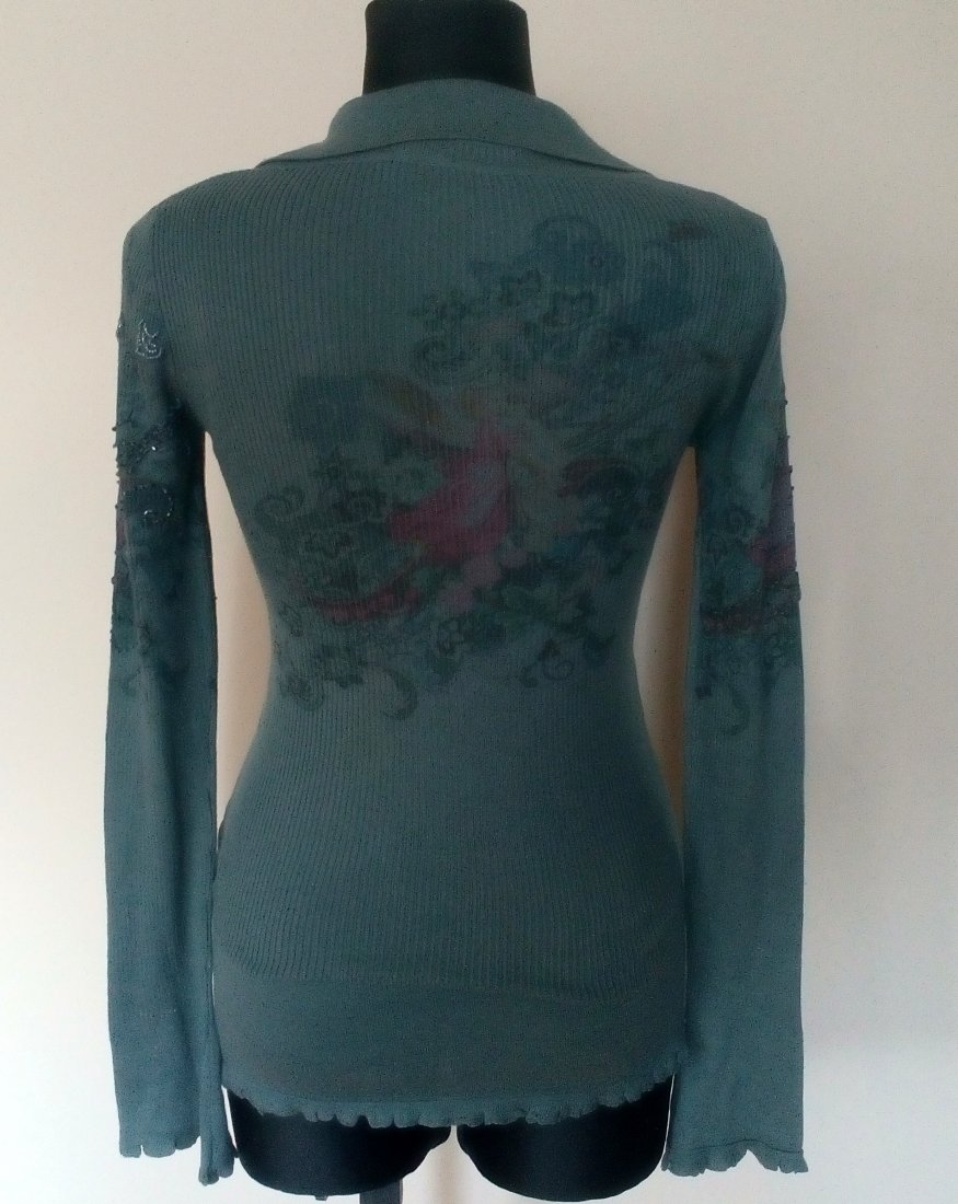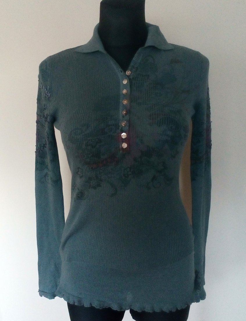 Dzianinowa bluzka, podwójna - od spodu doszyty gładki top wystający spod górnej bluzki, dół topu z falbanką, wierzchnia bluzka z dzianiny prążkowanej, z kołnierzykiem, zapinana od góry na małe guziki, bluzka zdobiona stonowanym nadrukiem, rękawy na przedramieniu dodatkowo ozdobione drobnymi makaronikami, dół rękawów leciutko rozszerzany z falbanką jak u dołu topu, kolor bazowy - zielony khaki