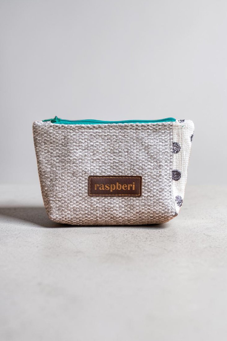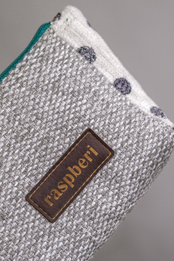Etui na klucze wykonane z szarej plecionki i żakardu w grochy. Stworzone w duchu no waste.