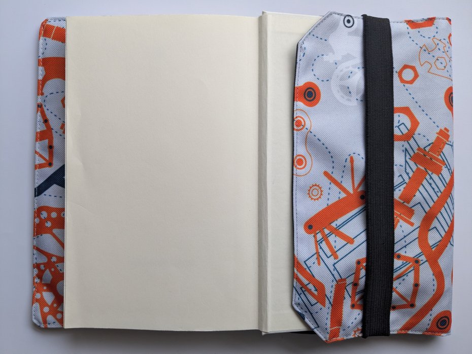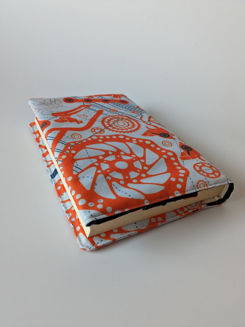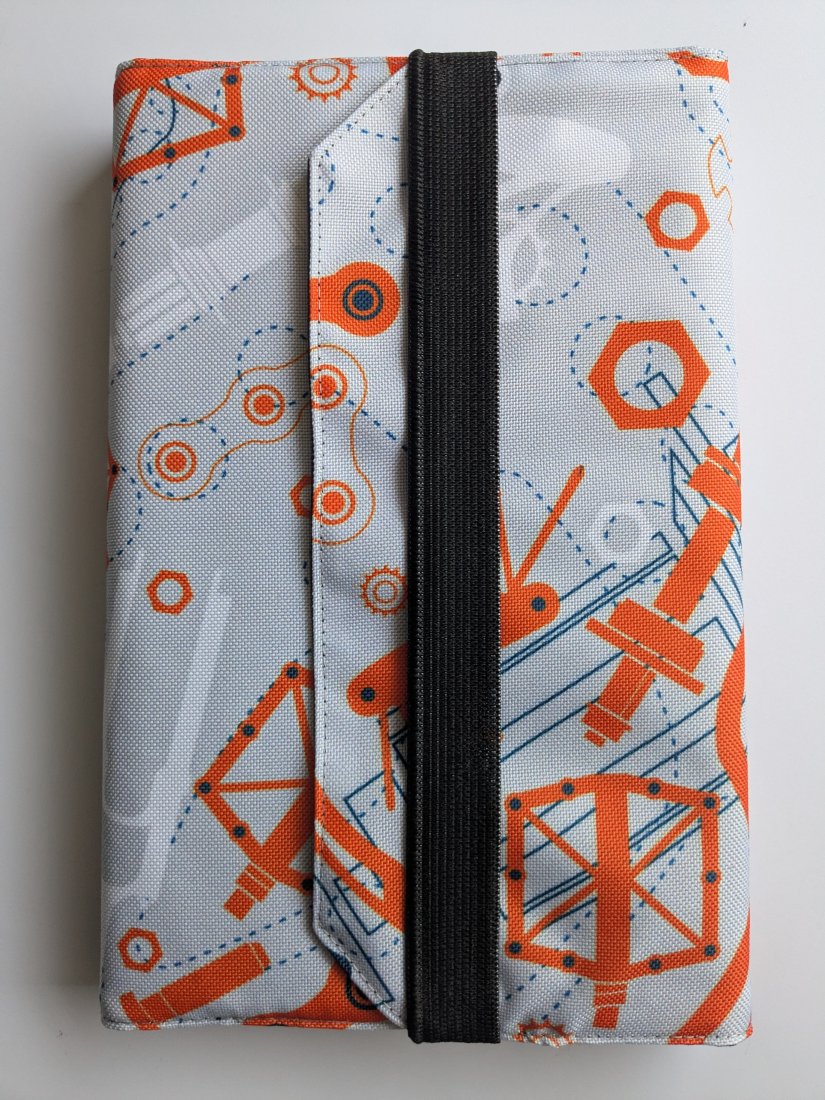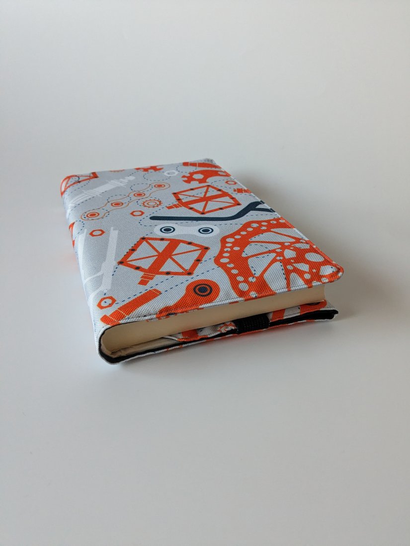 Całość wykonałam z tkaniny wodoodpornej, część zewnętrzna kolorowego printu w części rowerowe, wnętrze natomiast z czarnej, gładkiej tkaniny. Praktyczna gumka może stanowić zakładkę ale pozwoli Ci również zamknąć książkę czy notatnik w środku i chronić zarówno strony jak i okładkę. Otulacz jest odpowiedni dla formatu A5.