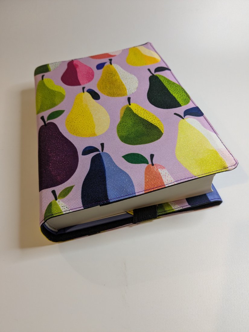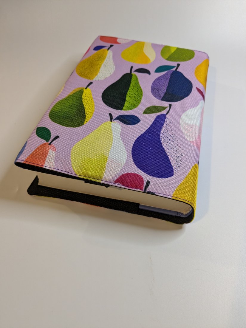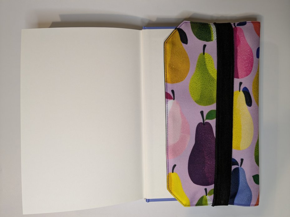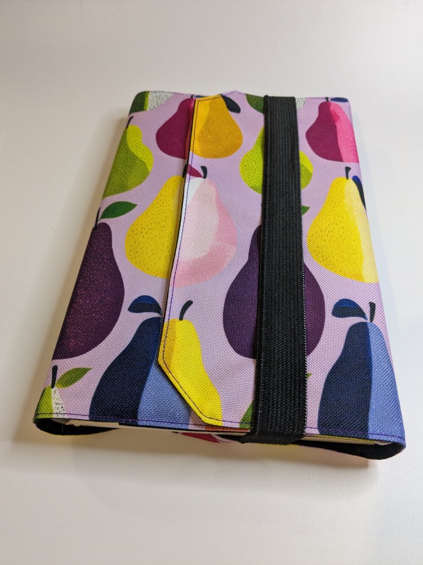 Całość uszyta z tkaniny wodoodpornej, część zewnętrzna z liliowego printu w kolorowe gruszki, wnętrze natomiast stanowi czarna gładka tkanina. Praktyczna gumka może sprawdzić się jako zakładka ale pozwoli Ci również zamknąć książkę czy notatnik w środku i chronić zarówno strony jak i okładkę. Otulacz jest odpowiedni dla formatu A5.