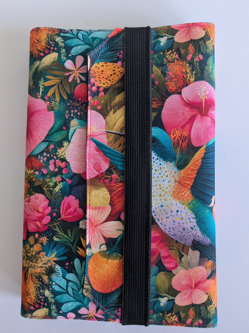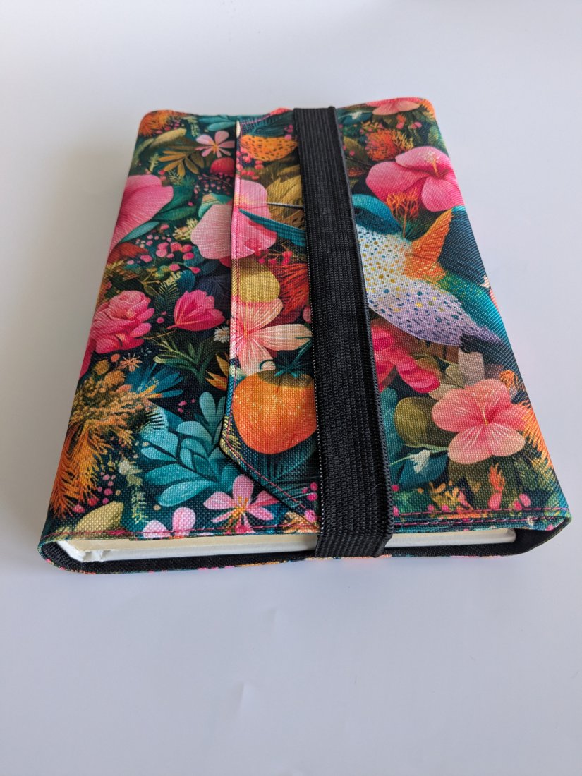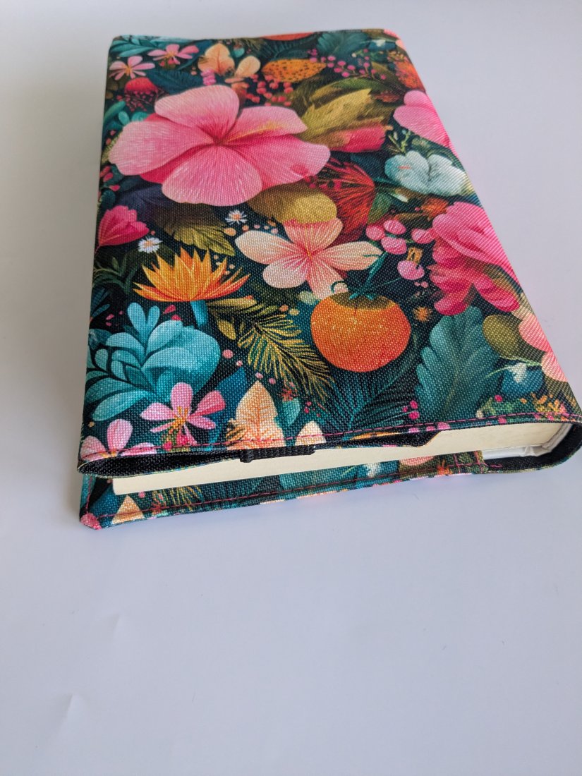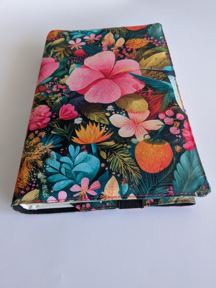 Całość wykonałam z tkaniny wodoodpornej, część zewnętrzna z kolorowego printu w kwiaty i owoce, wnętrze natomiast z czarnej, gładkiej tkaniny. Praktyczna gumka może stanowić zakładkę ale pozwoli Ci również zamknąć książkę czy notatnik w środku i chronić zarówno strony jak i okładkę. Otulacz jest odpowiedni dla formatu A5.