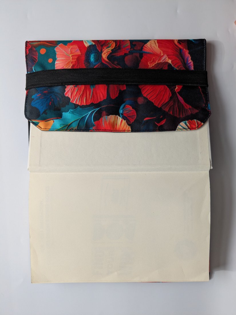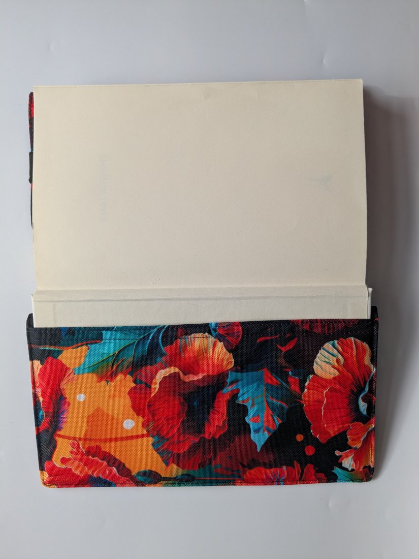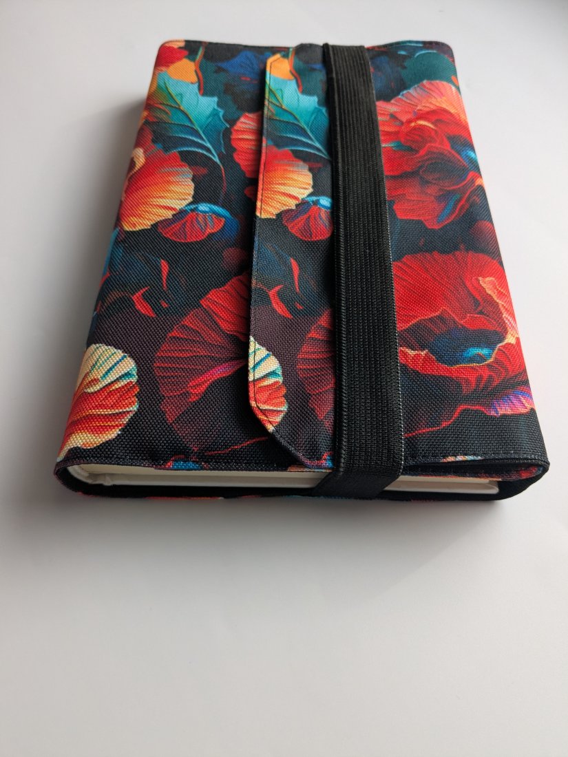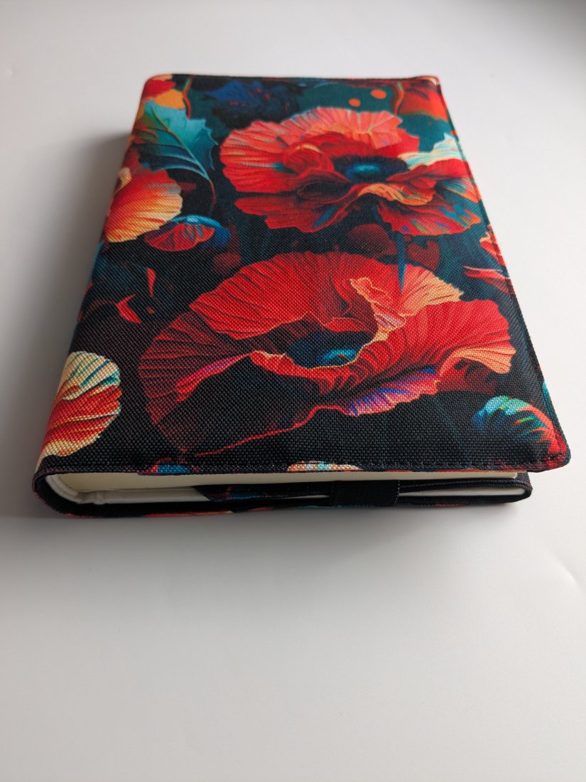 Całość wykonałam z tkaniny wodoodpornej, część zewnętrzna z kwiecistego, makowego printu, wnętrze natomiast z czarnej, gładkiej tkaniny. Praktyczna gumka może stanowić zakładkę ale pozwoli Ci również zamknąć książkę czy notatnik w środku i chronić zarówno strony jak i okładkę. Otulacz jest odpowiedni dla formatu A5.