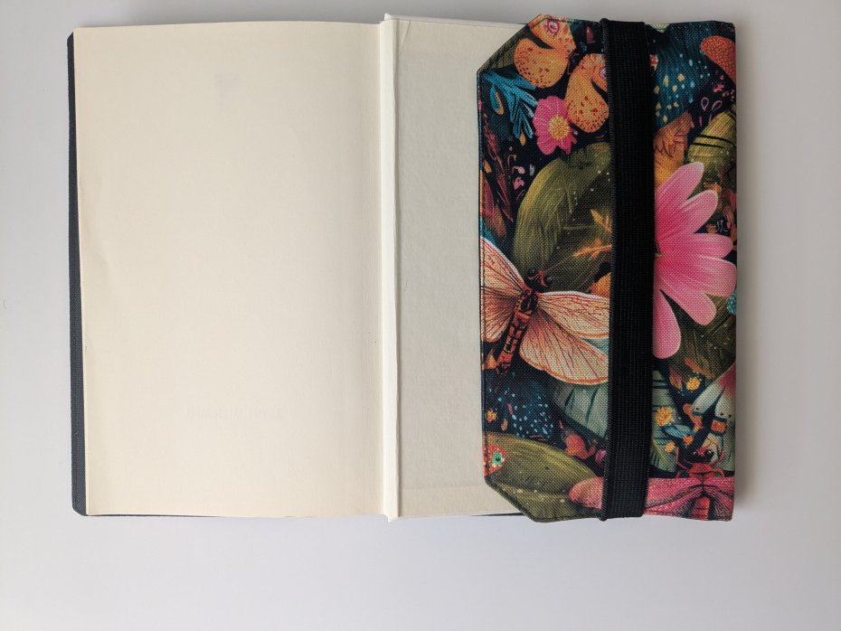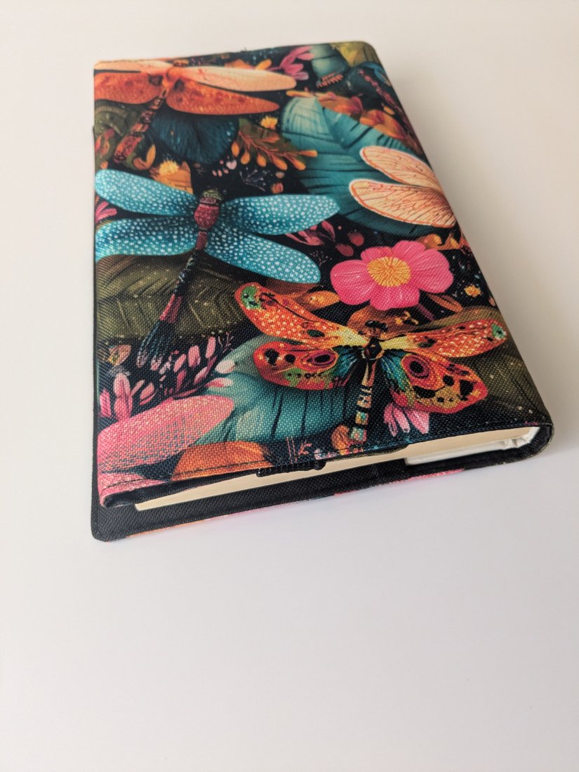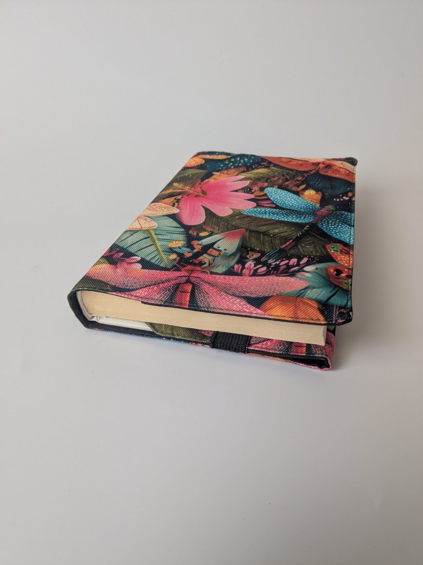 Całość wykonałam z tkaniny wodoodpornej, część zewnętrzna kolorowego printu w ważki, wnętrze natomiast z czarnej, gładkiej tkaniny. Praktyczna gumka może stanowić zakładkę ale pozwoli Ci również zamknąć książkę czy notatnik w środku i chronić zarówno strony jak i okładkę. Otulacz jest odpowiedni dla formatu A5.