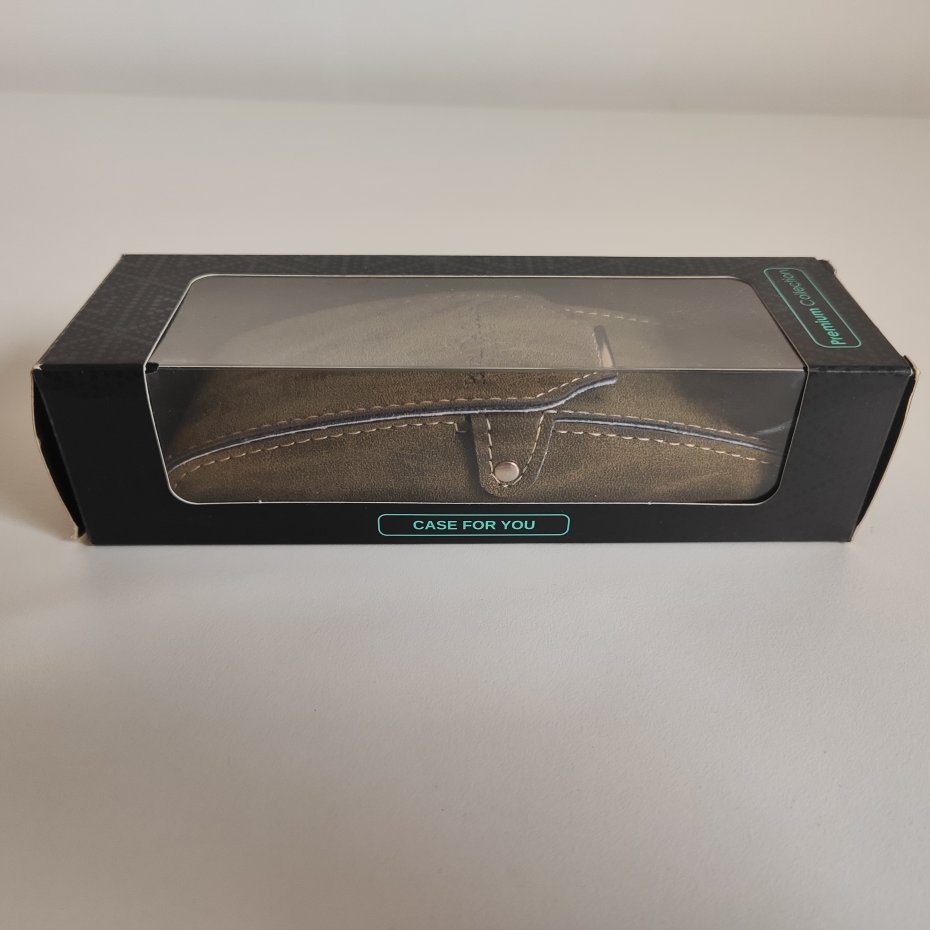 Etui zapinane na napy, dołączona ściereczka z mikrofibry do okularów we wzorze wyściółki wewnętrznej etui w oryginalnym opakowaniu.