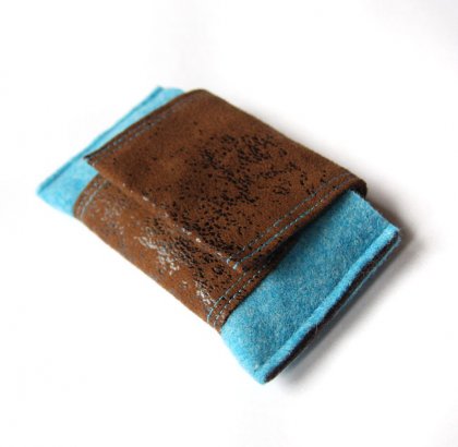 Etui na telefon wykonane z filcu w dwóch kolorach ( na zewnątrz turkusowy, wewnątrz ciemnobrązowy) oraz zamszu gobi w kolorze czekolady. Zapinane na magnes. Wymiar : 8 x 12,5 cm. Możliwość wykonania etui o konkretnych wymiarach.