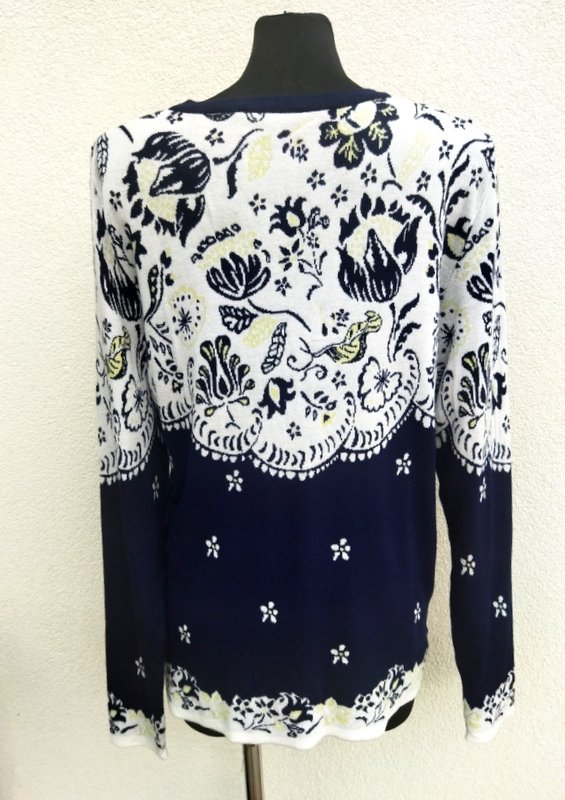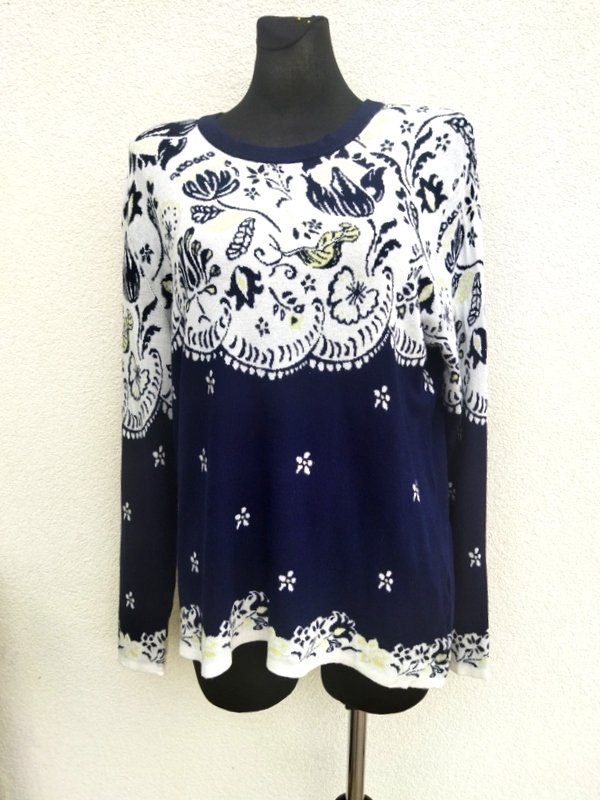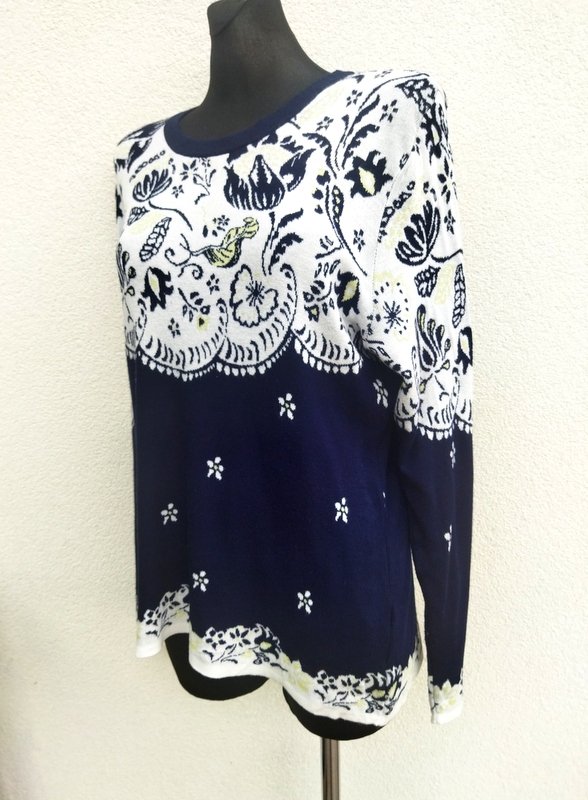 Miły mięciutki wzorzysty sweter w kolorystyce granatu, bieli i jasnej limonki.
