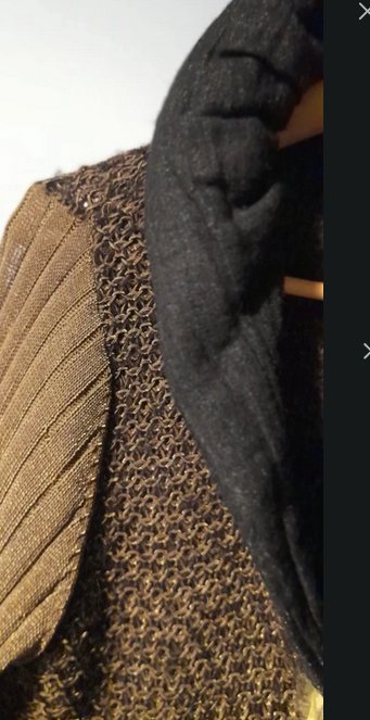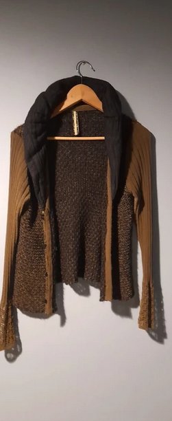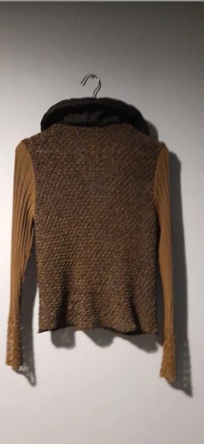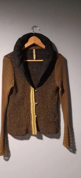 Piękny sweter z łączonych materiałów i faktur, khaki,czarny, zgaszony żółty, niezwykłe kolory, guziki i wykończenia tworzą niepowtarzalną całość, stan idealny, rozmiar uniwersalny od 36 do 42, sweter dopasowuje się do sylwetki, korpus ażurowy, rekaw dzianinowy, kołnierz z materiału wypełninego w srodku ,daje sie modelować, zdjecia robione w sztucznym świetle w realu bardziej zielony, oprócz faktycznie żółtej listwy z guzikami