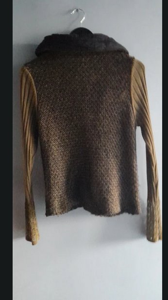 Piękny sweter z łączonych materiałów i faktur, khaki,czarny, zgaszony żółty, niezwykłe kolory, guziki i wykończenia tworzą niepowtarzalną całość, stan idealny, rozmiar uniwersalny od 36 do 42, sweter dopasowuje się do sylwetki, korpus ażurowy, rekaw dzianinowy, kołnierz z materiału wypełninego w srodku ,daje sie modelować, zdjecia robione w sztucznym świetle w realu bardziej zielony, oprócz faktycznie żółtej listwy z guzikami
