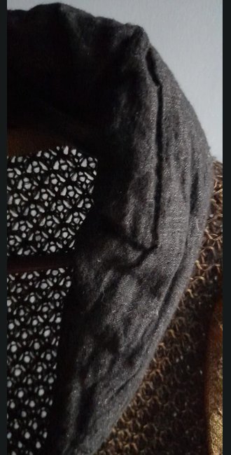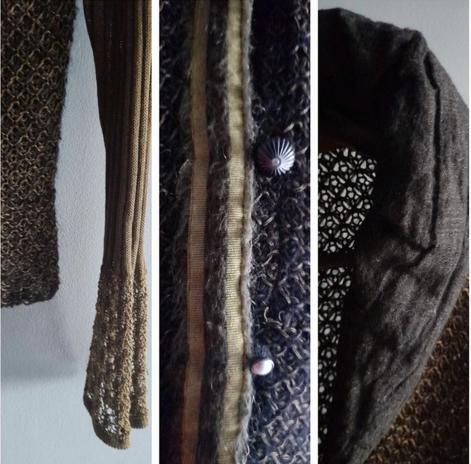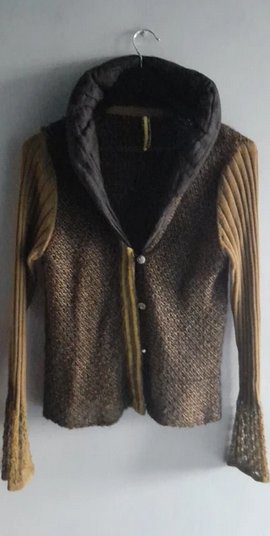 Piękny sweter z łączonych materiałów i faktur, khaki,czarny, zgaszony żółty, niezwykłe kolory, guziki i wykończenia tworzą niepowtarzalną całość, stan idealny, rozmiar uniwersalny od 36 do 42, sweter dopasowuje się do sylwetki, korpus ażurowy, rekaw dzianinowy, kołnierz z materiału wypełninego w srodku ,daje sie modelować, zdjecia robione w sztucznym świetle w realu bardziej zielony, oprócz faktycznie żółtej listwy z guzikami