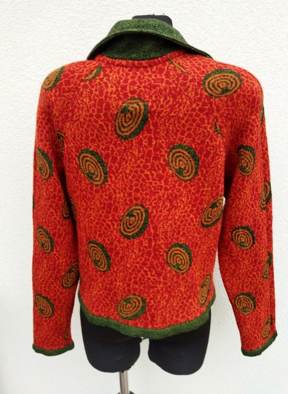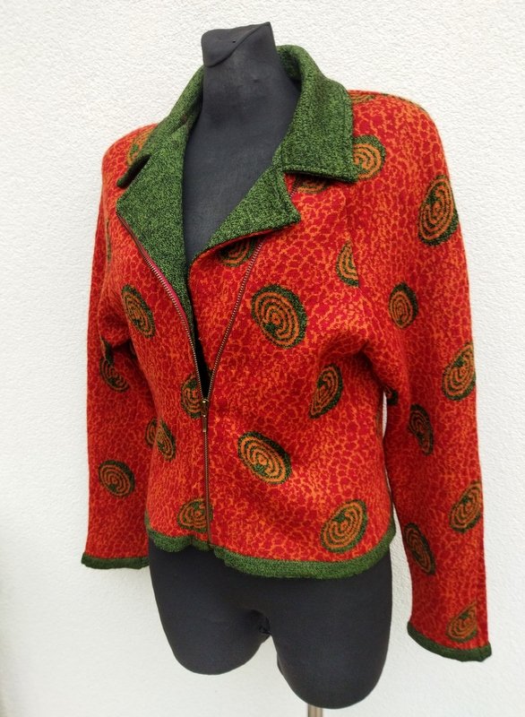 Wzorzysty sweter lub dzianinowa kurtka a' la ramoneska w kolorze jarzębinowej czerwieni, marchewkowej żółci i zieleni . Z kołnierzem z rewersami, z raglanowymi rękawami. Zapinana na zamek.