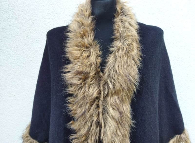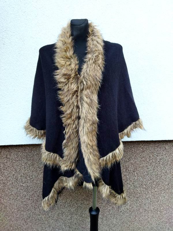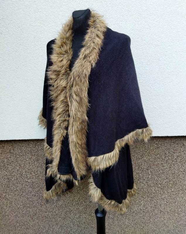 Dwuwarstwowa dzianinowa pelerynka w czarnym kolorze obszyta sztucznym beżowym futerkiem . Zapinana u góry na haftkę.