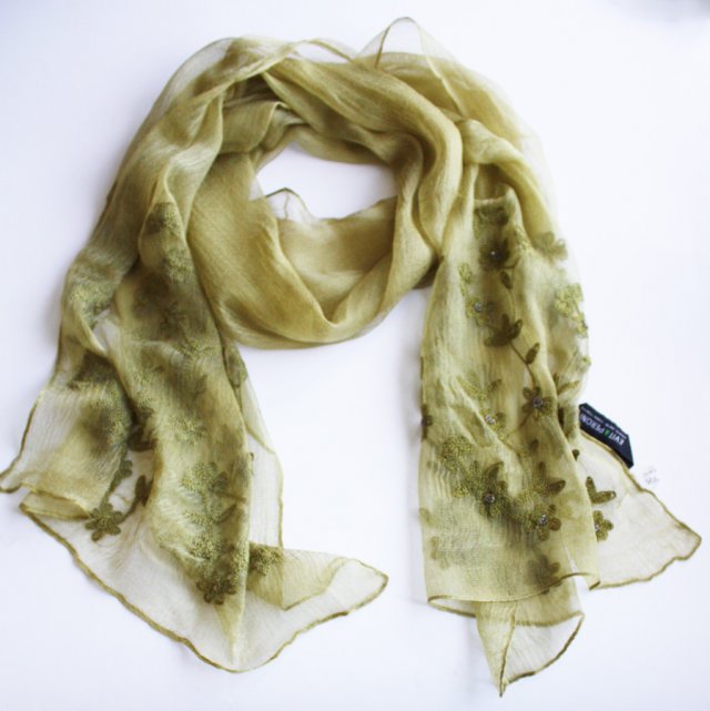 Przedstawiam Państwu niesamowity ekskluzywny szal renomowanej marki Evita Peroni. Szal wykonany z cienkiej, oliwkowej, siateczkowej wiskozy. Na krótszych brzegach ozdobiony wyszywanymi kwiatami, gdzieniegdzie pojawiają się też drobniutkie, delikatne koraliki.