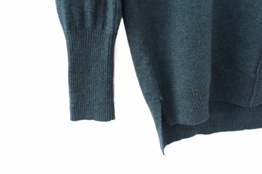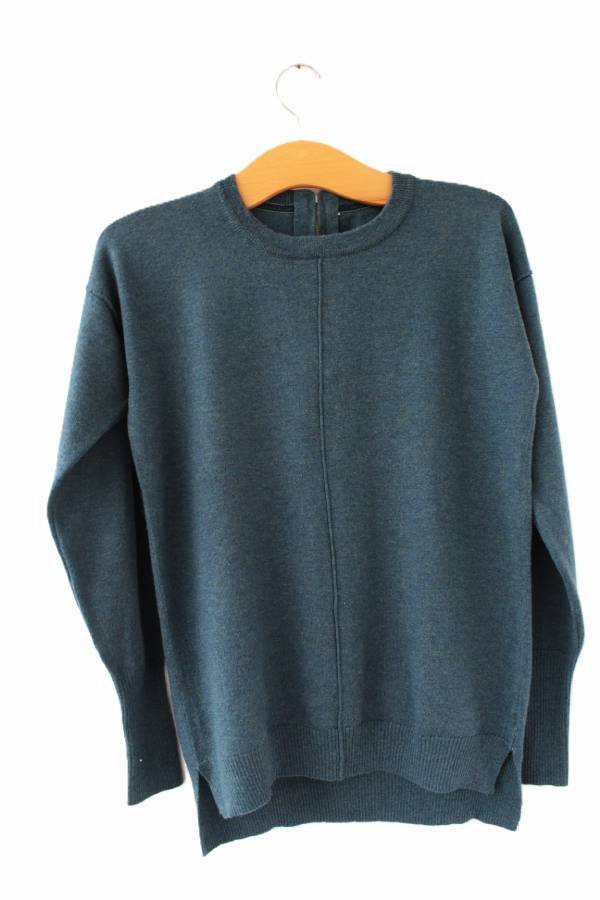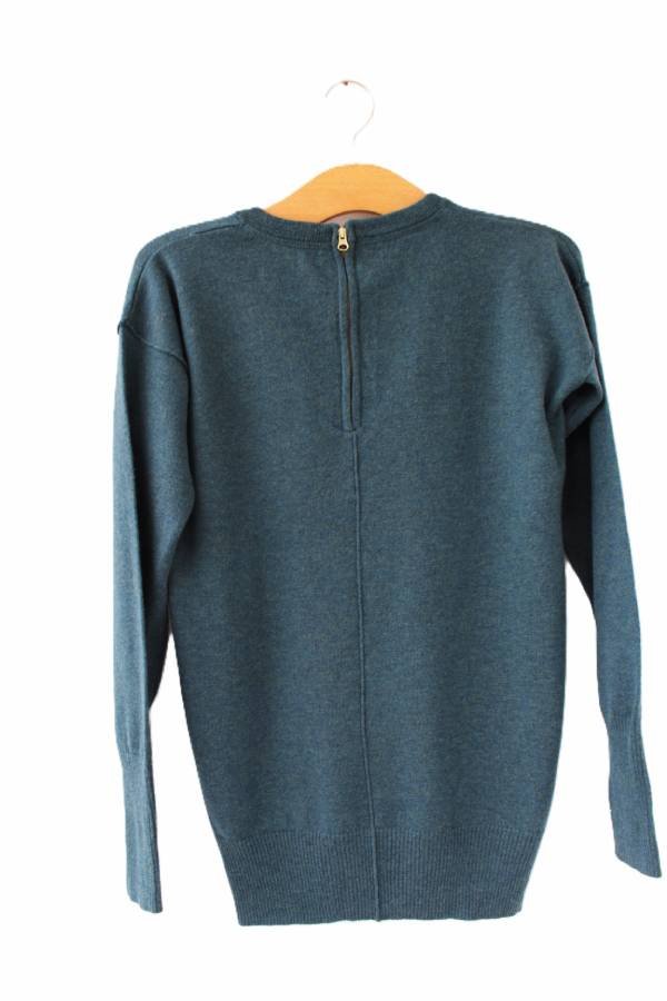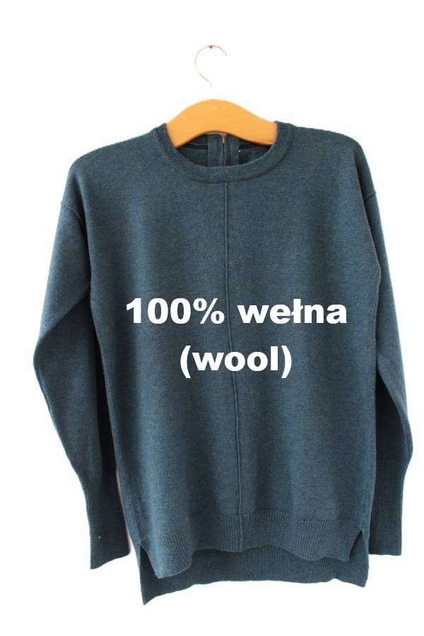 Przedstawiam Państwu sweter z wysokiej jakości wełny w pięknym nieoczywistym odcieniu morskim w ciemnej tonacji. Z tyłu krótki suwak.