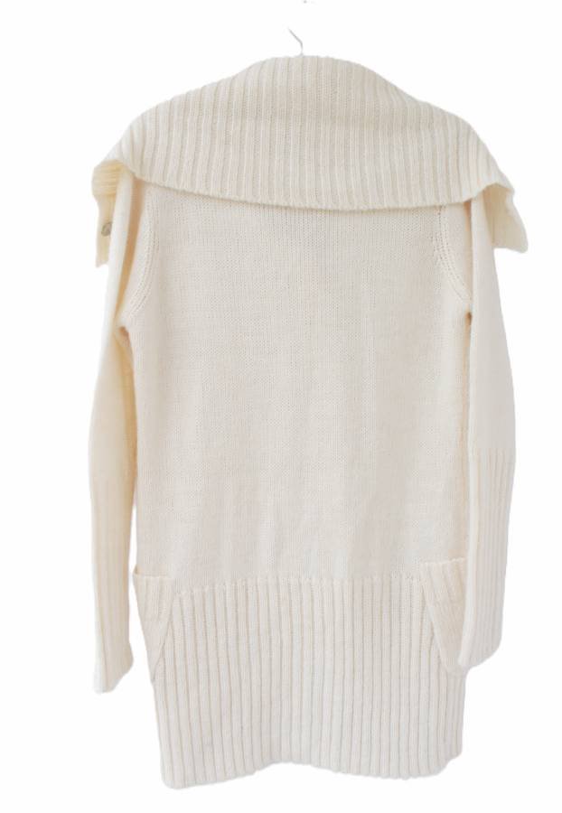 Przedstawiam Państwu ciepły sweter w kolorze kremowym z alpaką w przewadze w składzie materiałowym. Zapięcie na perłowe guziki.