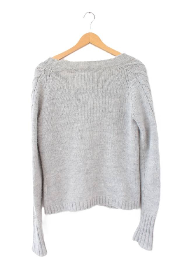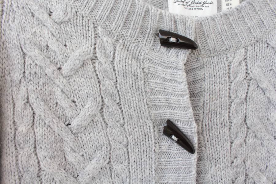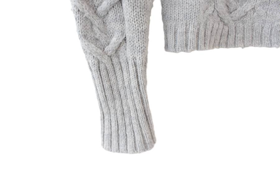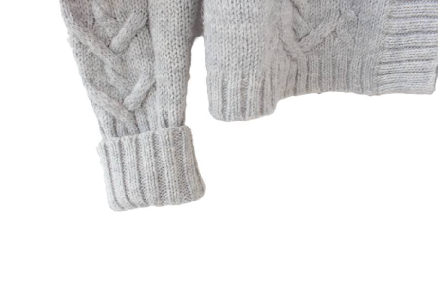 Przedstawiam Państwu szary sweter vintage z wełny, alpaki i domieszki syntetyku. Zapinany na dwa ozdobne guziki u góry. Mankiety można nosić długie lub wywinąć.
