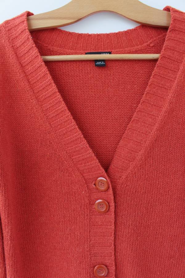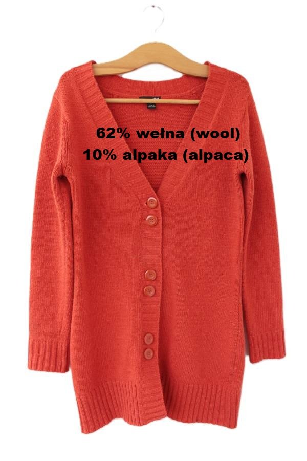 Przedstawiam Państwu marchewkowy kardigan z wełny, alpaki i domieszki syntetyku. Piękny, ciepły kolor.