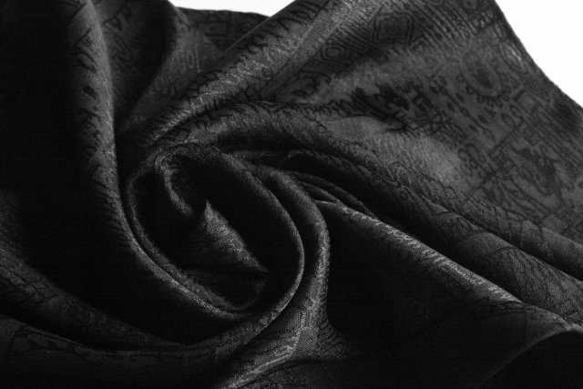 Przedstawiam Państwu szal ze stuprocentowego jedwabiu. Wytłaczany, szalenie elegancki. Ponadczasowa czerń pasująca do każdej stylizacji. Gęste, piękne frędzle.
