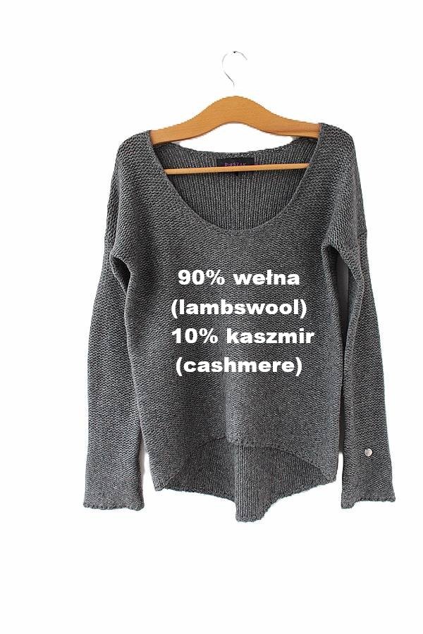 Przedstawiam Państwu szary sweter vintage, który łączy w sobie wyrafinowanie i minimalizm. Ciekawy krój - przód krótszy, łukowaty. Luksusowy skład - jagnięca wełna i kaszmir. Ekskluzywna duńska marka Pieszak.