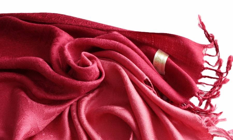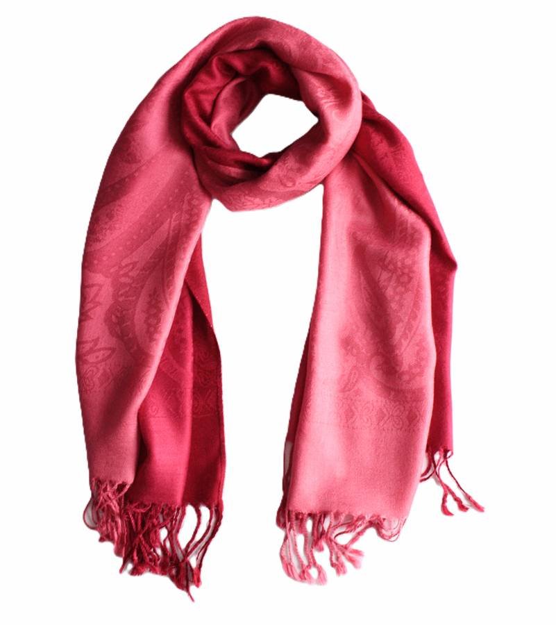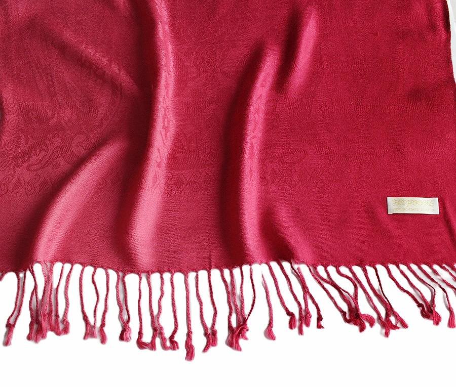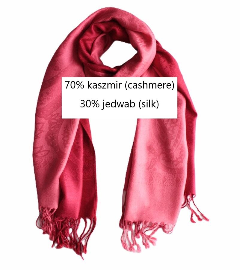 Przedstawiam Państwu wysokiej jakości duży szal Pashmina z kaszmiru i jedwabiu. Piękna, malinowa, cieniowana kolorystyka. Wytłaczany wzór.