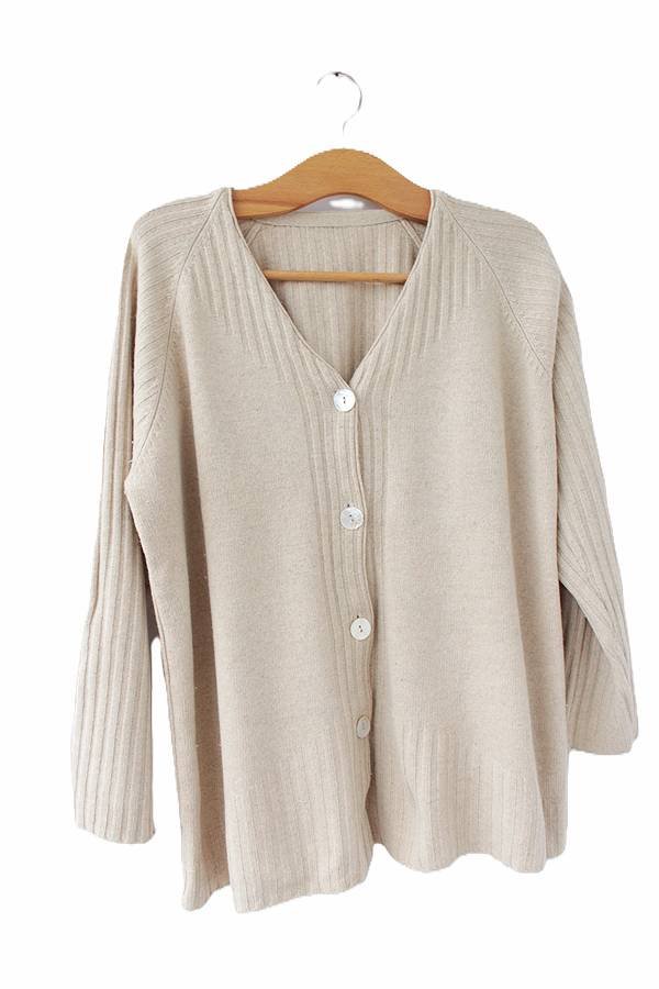 Przedstawiam Państwu beżowy kardigan z wełny, angory, kaszmiru i wiskozy. Piękne, perłowe guziki.