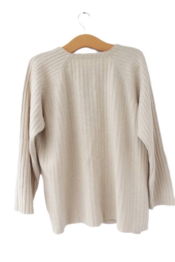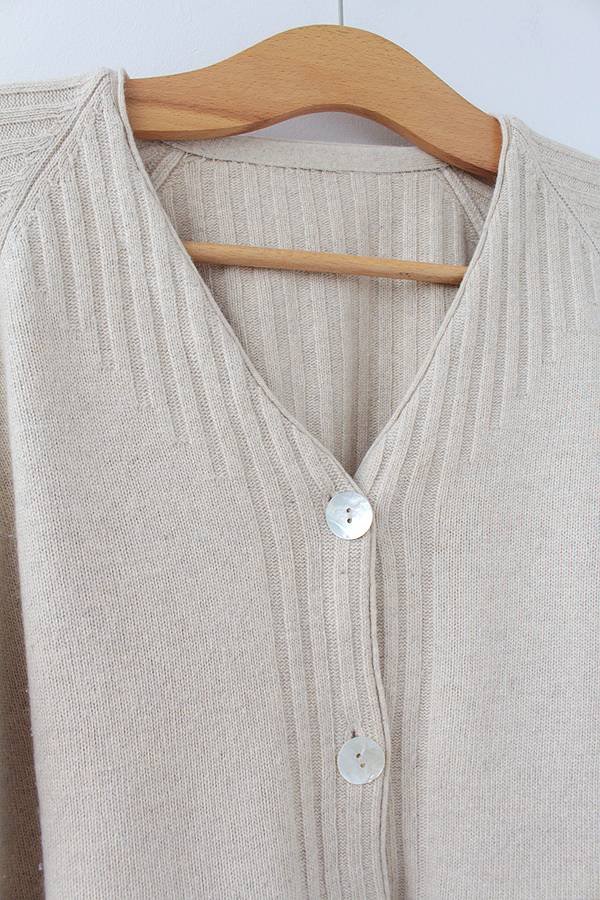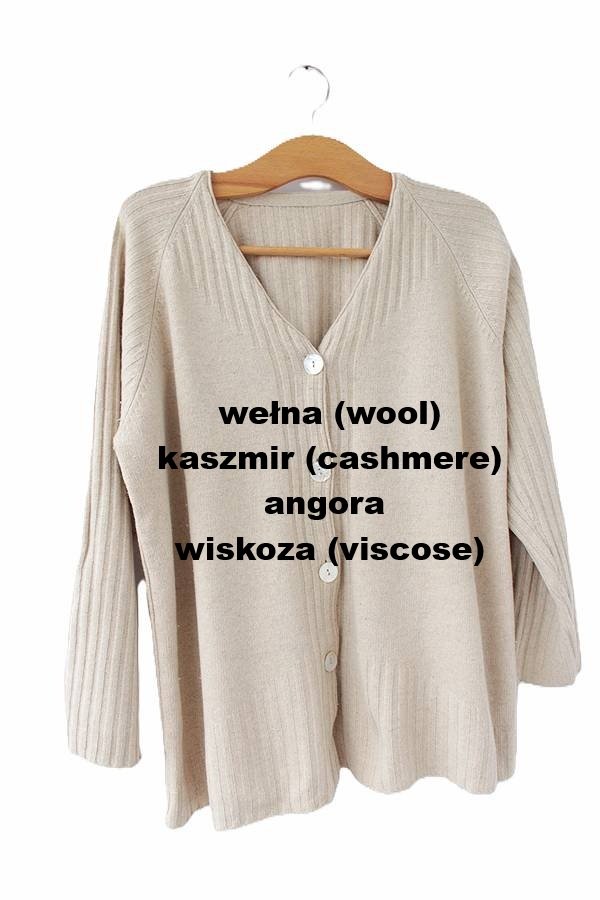 Przedstawiam Państwu beżowy kardigan z wełny, angory, kaszmiru i wiskozy. Piękne, perłowe guziki.
