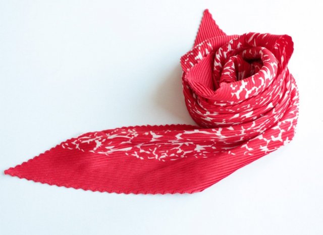 Przedstawiam Państwu wspaniały szal w czerwono-białe wzory. Pięknie drobno plisowany niczym bibułka Rafaello:). Świetnie prezentuje się na przykład w biznesowym wydaniu w połączeniu z koszulą. Można też nosić go na głowie jako opaska lub związać nim kucyk.