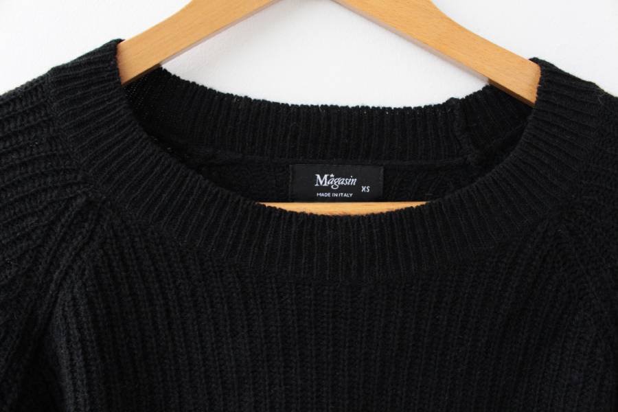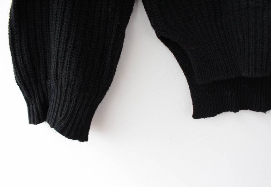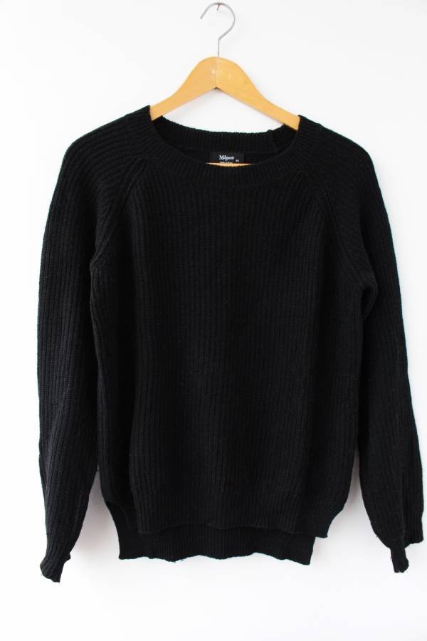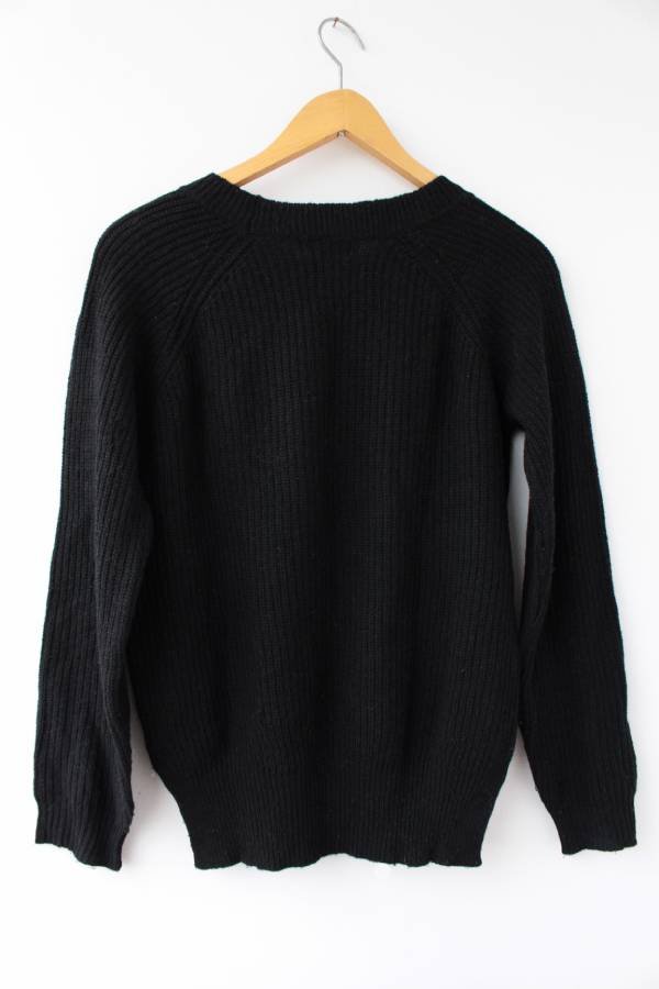 Przedstawiam Państwu czarny sweter z wysokiej jakości wełny jagnięcej z domieszką syntetyku. Piękna, puszysta struktura. Z przodu nieco krótszy niż z tyłu.