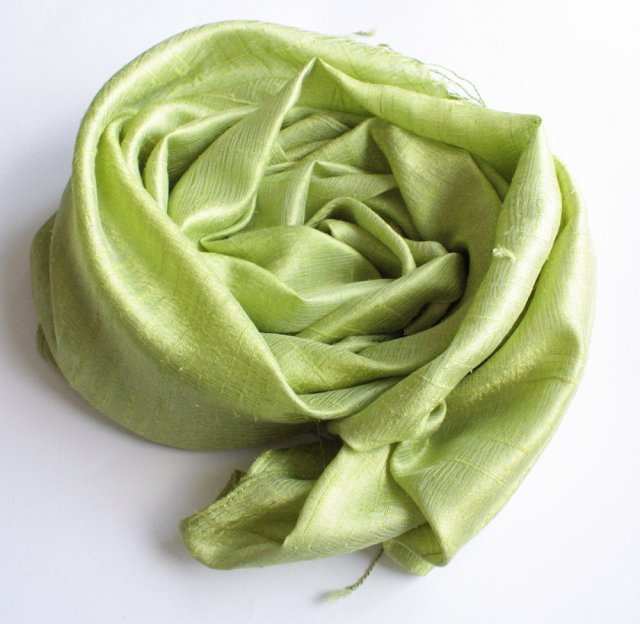 Przedstawiam Państwu szal ze stuprocentowego jedwabiu, tzw. surowego (niejednolicie tkane nitki, nierówna struktura to urok tego typu jedwabiu). Luksusowa marka Mathlau. Wykończenie spiralnie skręcanymi frędzlami. Kolor to świetlisty odcień zieleni typu zielony groszek.