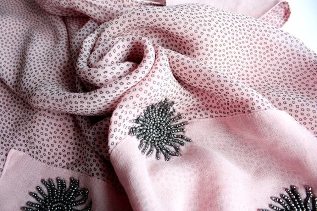 Przedstawiam Państwu duży pudrowy szal renomowanej firmy Noa Noa. Szal uszyto z tkaniny w typie żorżety jedwabnej lub jedwabnej syntetycznej. Dodatek został zszyty z 2 identycznych gatunkowo tkanin. Szal ozdobiono misternie przyszywanymi koralikami ułożonymi promieniście w kwiatowe wzory.