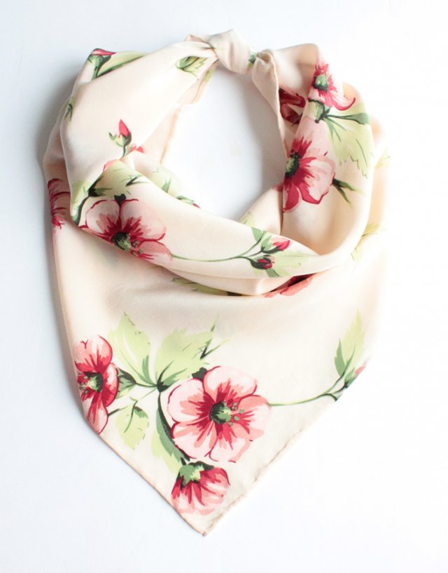 Przedstawiam Państwu niezwykle subtelną kwiatową apaszkę. Materiał jest bardzo delikatny, matowy, jest to jedwab o ręcznie rolowanych brzegach, ale niestety chusta nie ma metki.