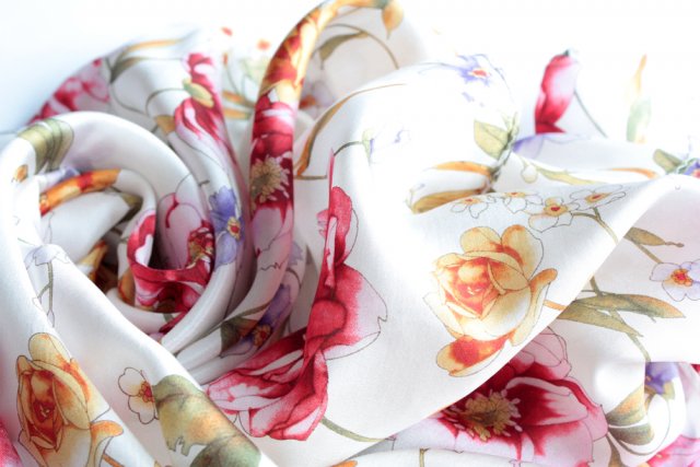 Przedstawiam Państwu przepiękną chustę ze stuprocentowego, delikatnego, szalenie eleganckiego jedwabiu.Wzory kwiatowe na białym tle.