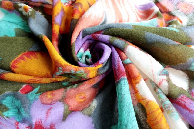 Przedstawiam Państwu wspaniały ekskluzywny szal w przepięknych głębokich kolorach. Miły w dotyku, mięciutki, doskonały jakościowo materiał (5% jedwab, 95% wełna). Materiał nie gryzie. Szal jest luźno tkany, cienki i będzie odpowiedni na chlodniejsze wiosenno-letnie dni. Można układać go na różne sposoby, szal jest duży i szeroki.