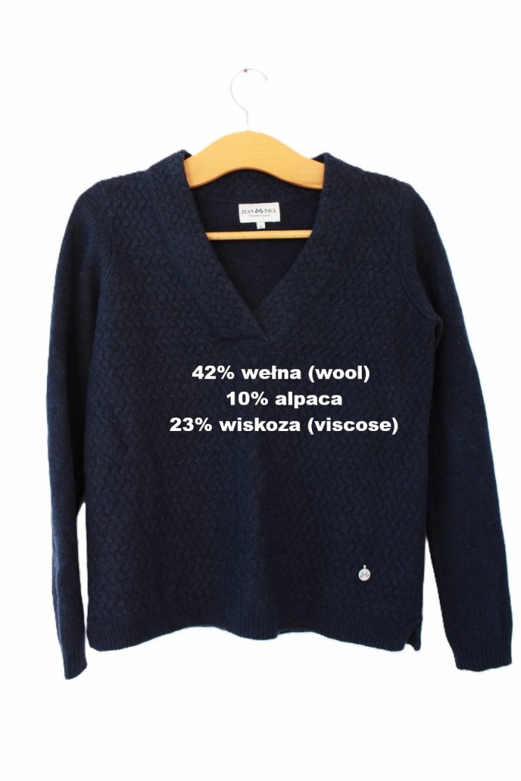 Przedstawiam Państwu granatowy klasyczny sweter damski z wysokiej jakości dzianiny z wełną, alpaką i wiskozą w składzie.