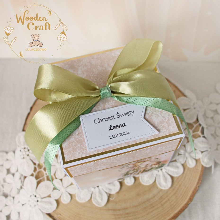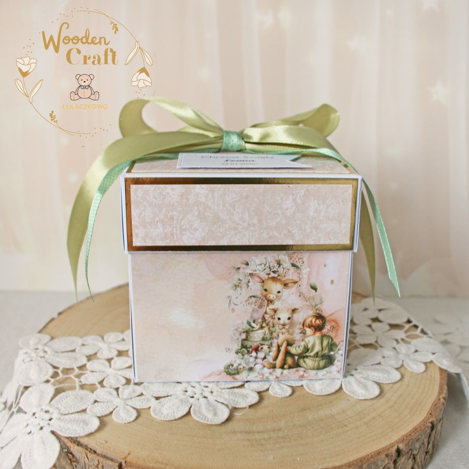 Przepiękna pamiątka chrztu świętego, roczku bądź narodzin, w formie exploding boxu utrzymanego w pięknych odcieniach brzoskwini, zgaszonej zieleni i bieli z dodatkiem złoych, błyszczących akcentów. Pudełeczko wykonane z mixu dziecięcych kolekcji papierów. Wieczko ozdobione zieloną kokardą oraz tagiem z imieniem dziecka i datą chrztu/narodzin/roczku - w zależności od okazji.
