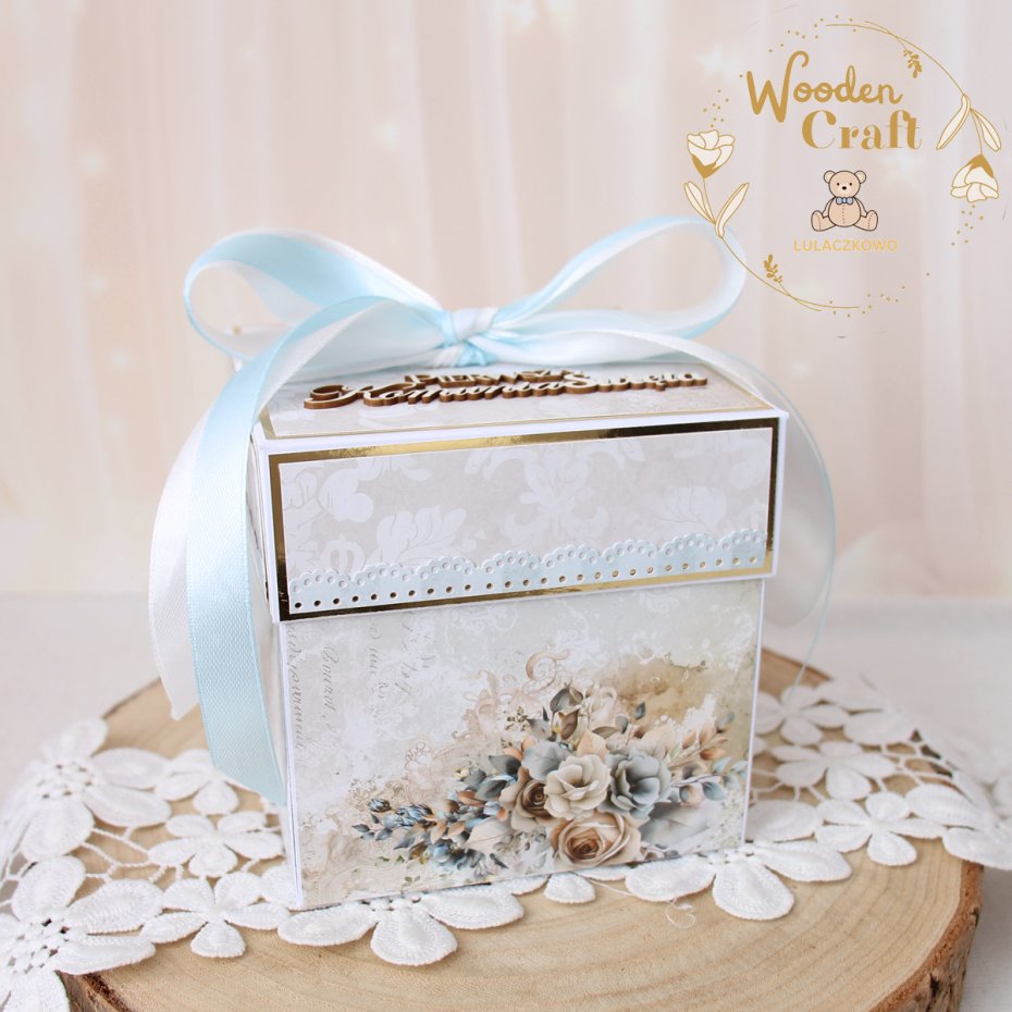Piękna i elegancka pamiątka Pierwszej Komunii Świętej w postaci exploding boxu. Pudełeczko wykonane z najwyższą starannością, z cudownej kolekcji papierów "In shades of blue", utrzymane w odcieniach delikatnego szaroniebieskiego, beżu i bieli z dodatkiem błyszczących, złotych akcentów.