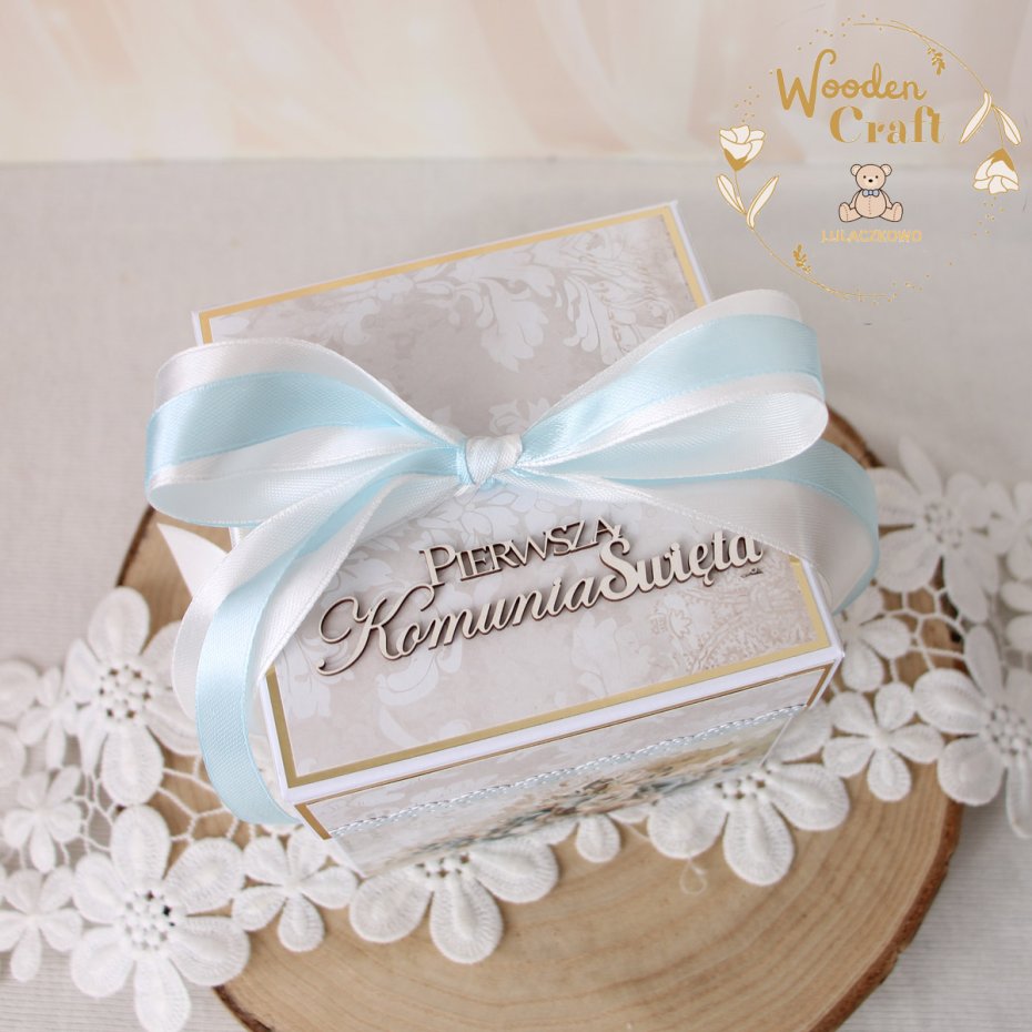 Wieczko boxa zdobi biało-błękitna kokarda oraz tekturkowy napis "Pierwsza Komunia Święta" (do napisu mogę dodać również imię dziecka oraz datę uroczystości).