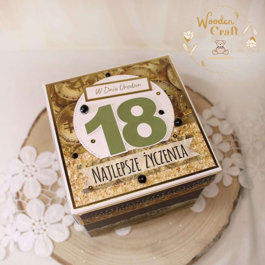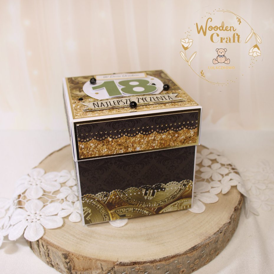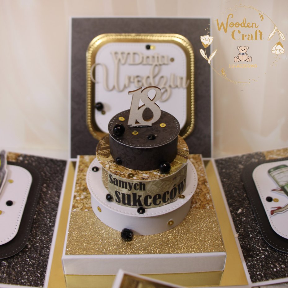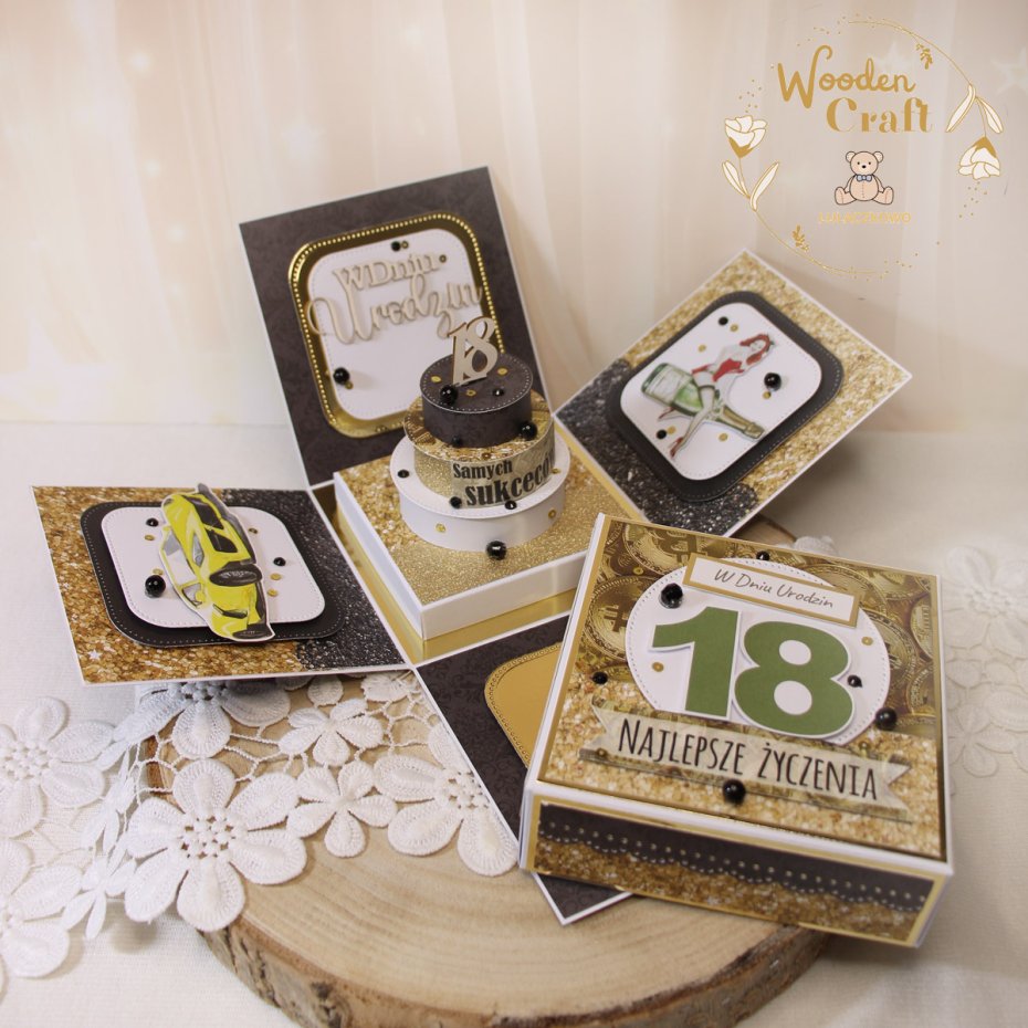 Rewelacyjny, męski exploding box na 18 urodziny, wykonany ręcznie z dbałością o każdy szczegół. Box utrzymany w odcieniach czerni i złota z dodatkiem bieli i żółtego koloru, wykonany z męskiej kolekcji papierów "Men's World". Wieczko ozdobione cyferkami 18 oraz napisami W Dniu Urodzin i Najlepsze Życzenia.