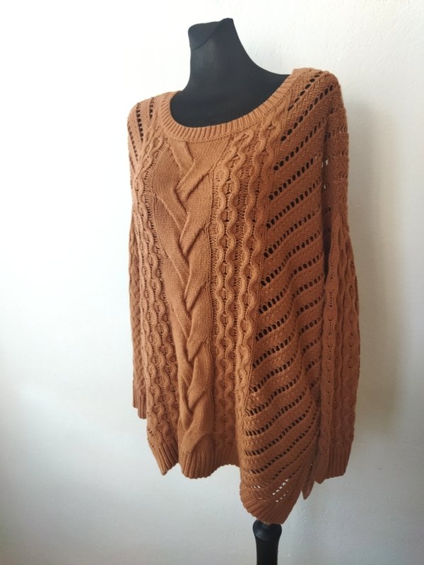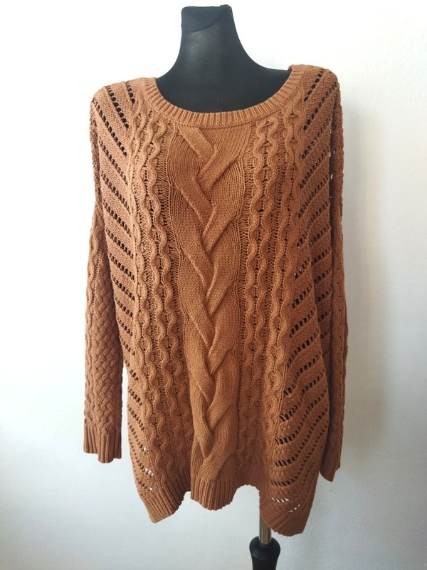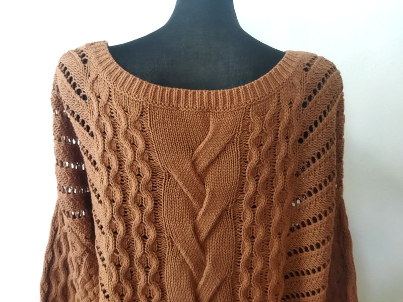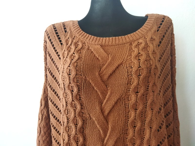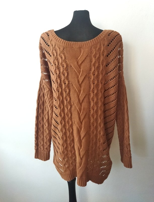 Luźny oversizowy sweter z bawełniano-akrylowej włóczki w koniakowo-orzechowym kolorze z warkoczowymi i lekko ażurowymi wzorami. Z owalnym dekoltem z rozcięciami po bokach i nisko wszywanymi rękawami. Asymetryczny - nieco dłuższy tył , wykończony ściągaczami