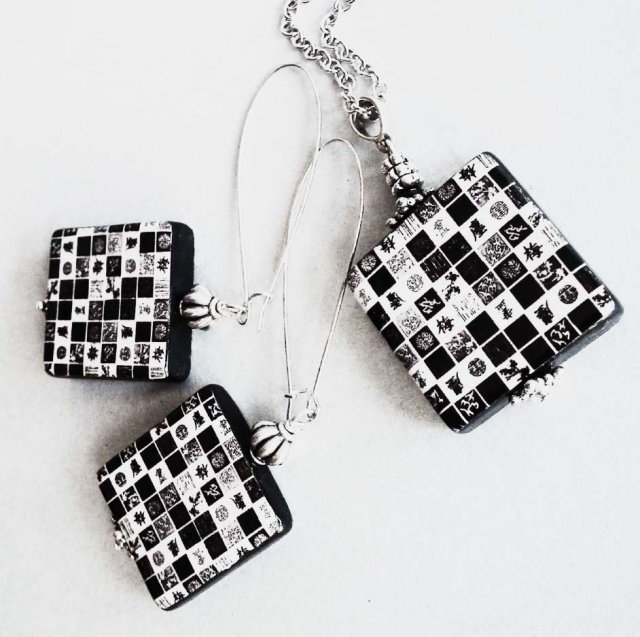 Interesujący geometryczny zestaw biżuterii- naszyjnik i kolczyki. Wykonany z malowanego i zdobionego grafiką drewna oraz elementów posrebrzanych antyalergicznych.