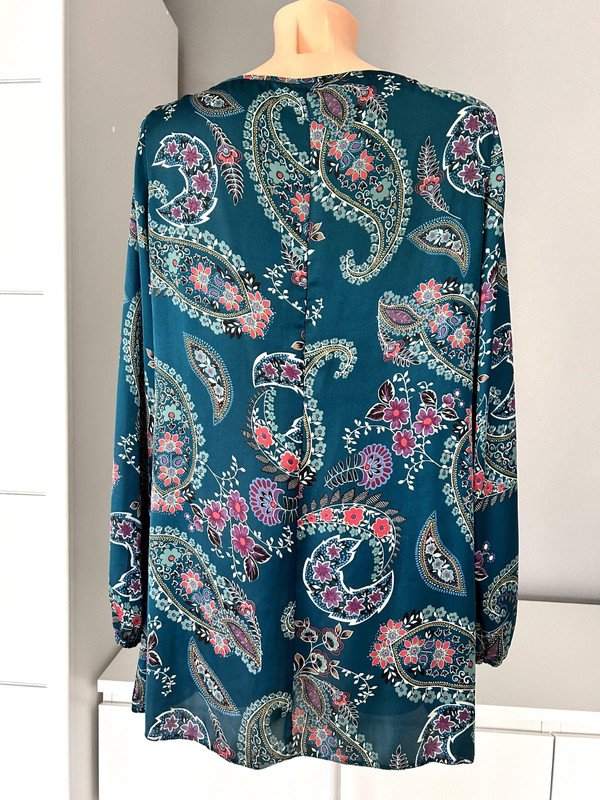 Turkusowa tunika F&F rozmiar z metki 16 XXL 44 ale moim zdaniem jest to rozmiar M/L ( wymiary podaję poniżej ). Orientalny wzór, materiał a'la satyna. Piękny dekolt łódka.