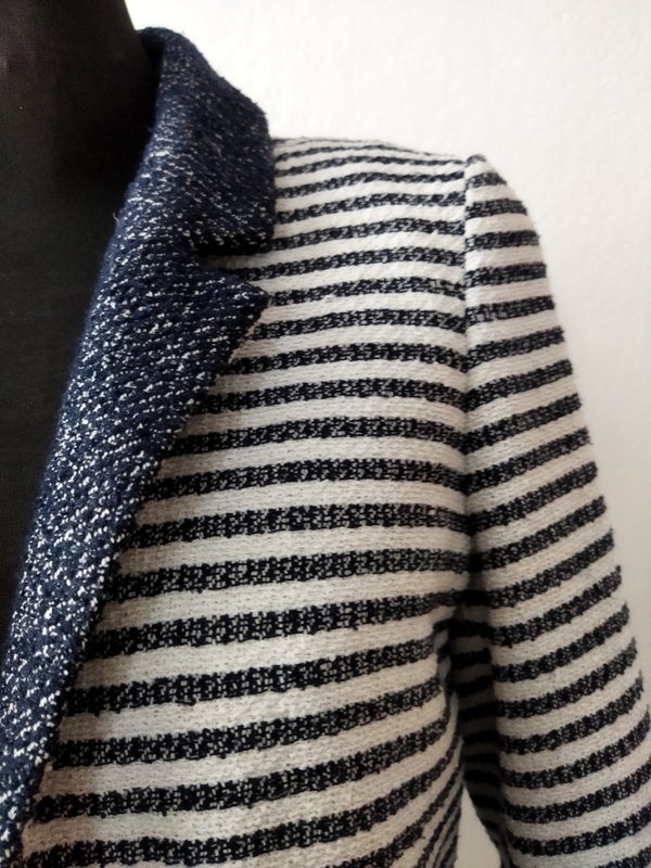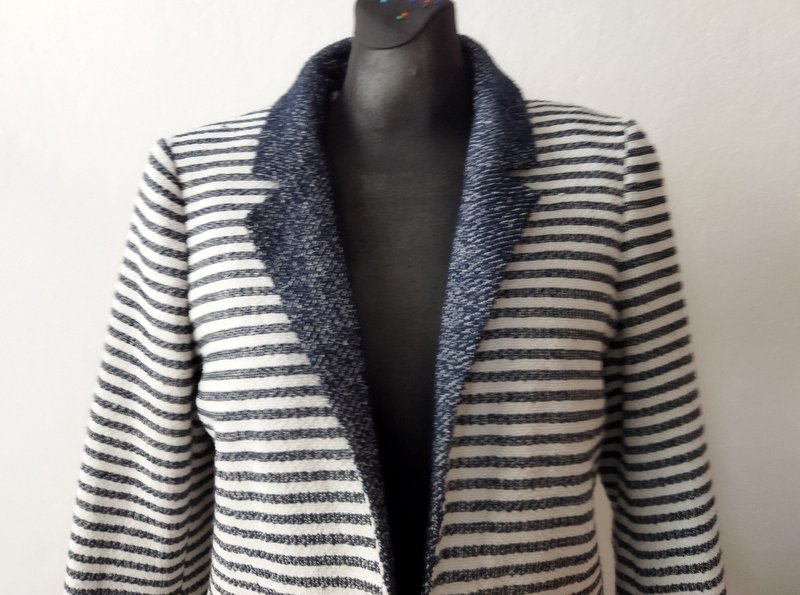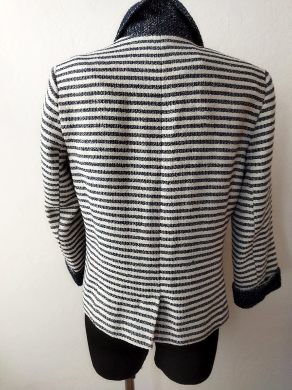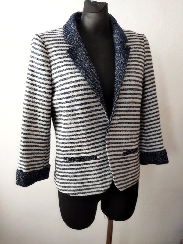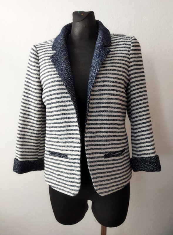 Marynarka z tkaniny z fakturą w biało- ciemnogranatowej prawie czarnej kolorystyce. Fason otwarty z dwiema wpuszczanymi kieszeniami, z rękawami 3/4, z krytym rozcięciem z tyłu . Całość na podszewce