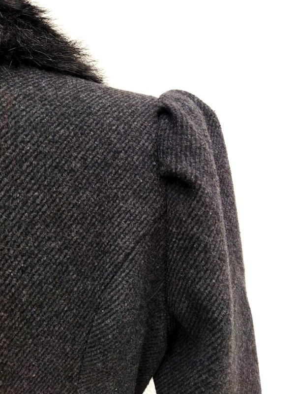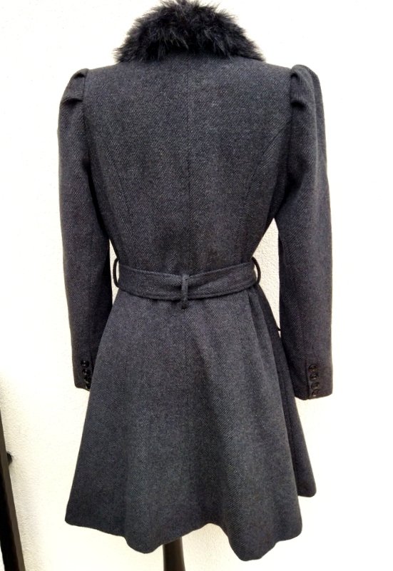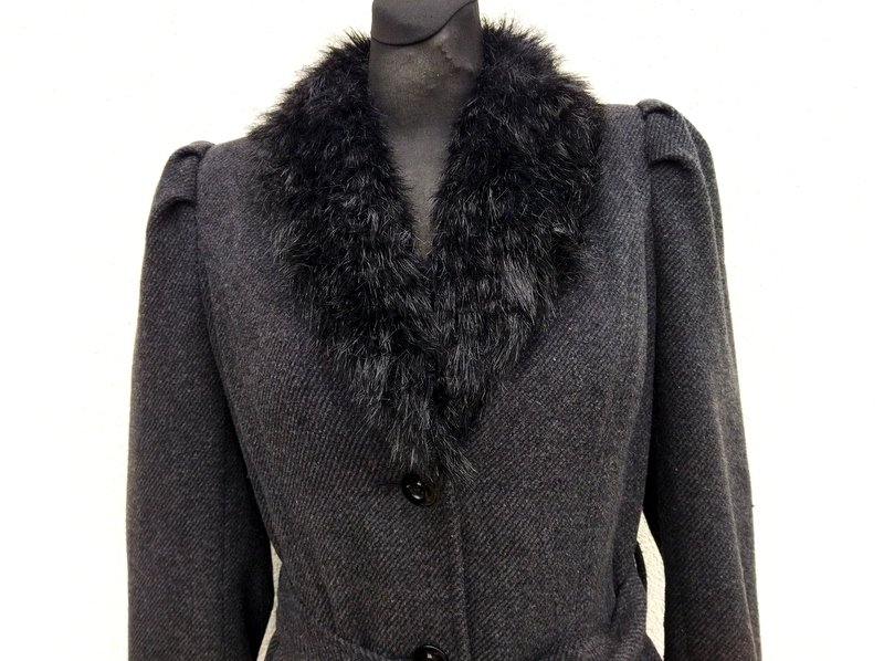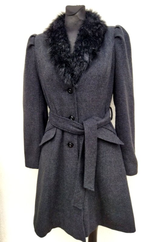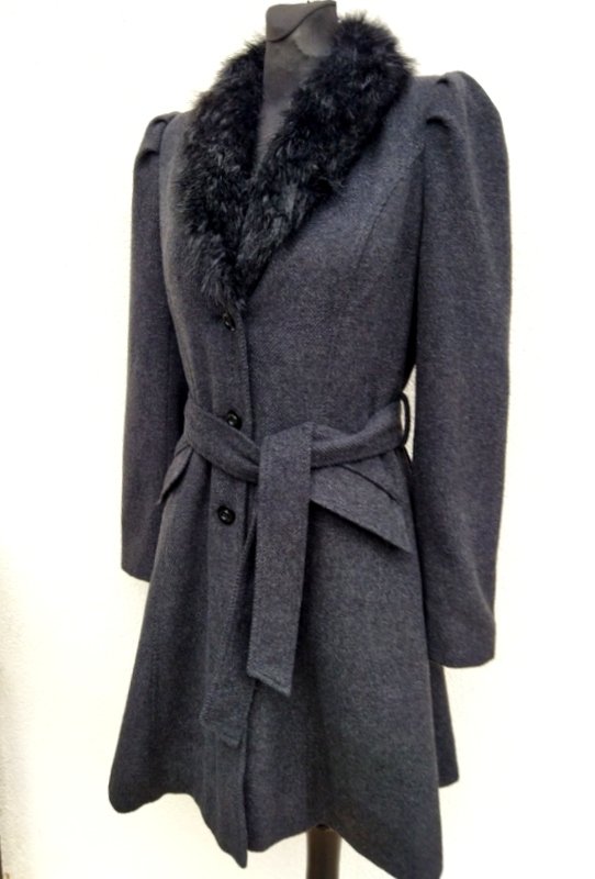 Zgrabny płaszcz w grafitowym kolorze. Odcinany w pasie , góra dopasowana z kołnierzem z czarnego sztucznego futerka , rękawy w główce lekko bufiaste z czterem guzikami na mankietach , dół rozkloszowany szyty z klinów, z dwiema wpuszczanymi kieszeniami z patkami. Wiązany paskiem w talii. Zapinany na guziki. całość na podszewce.