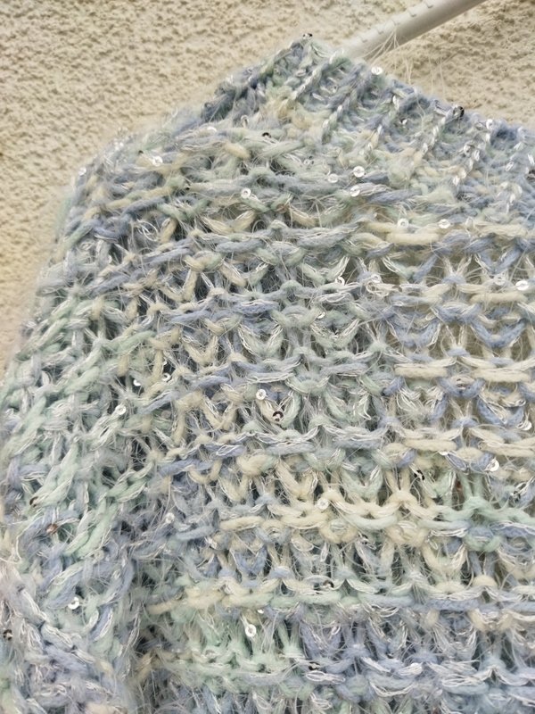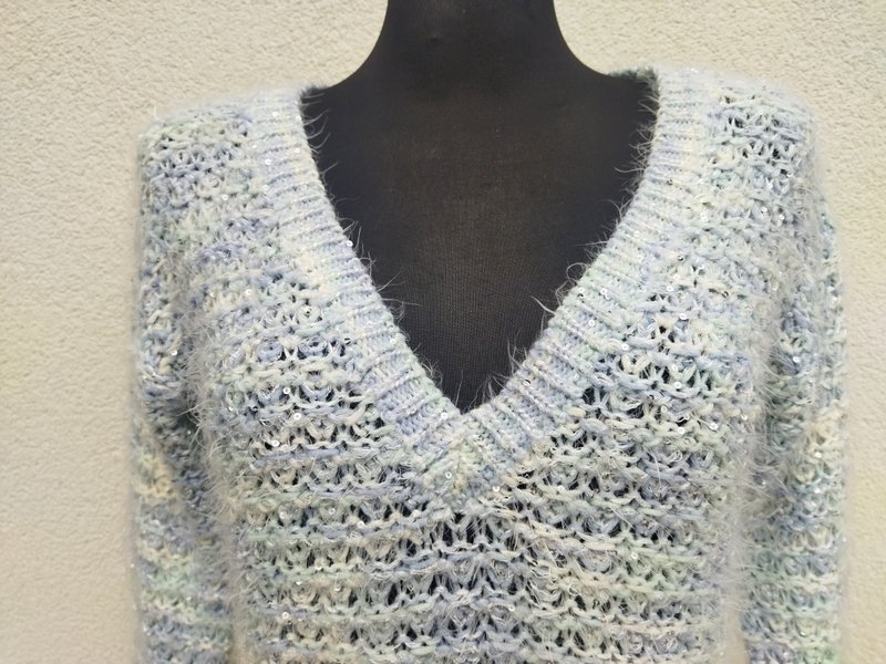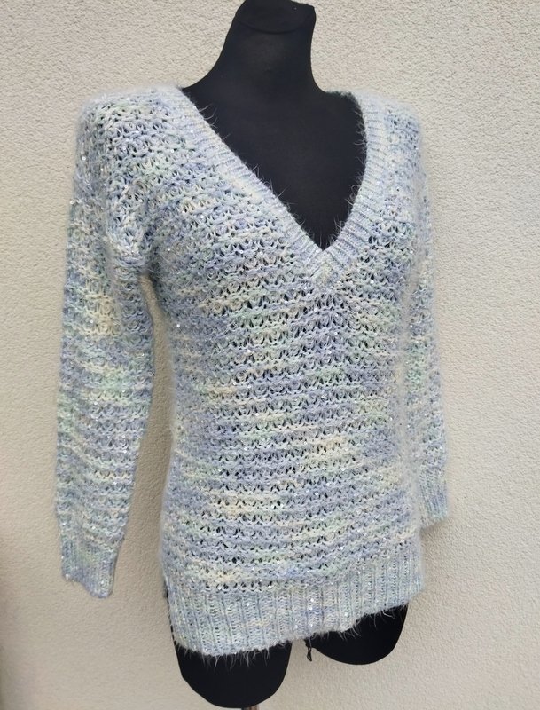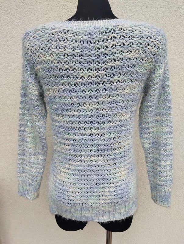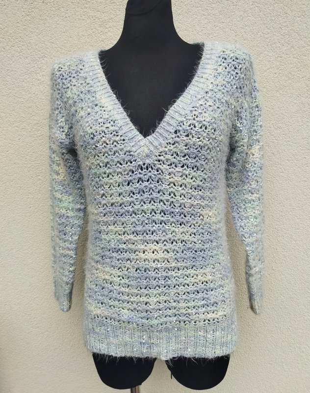 Miły sweter o luźnym splocie z akrylowej lekko trawiastej włóczki z domieszką nylonu i poliestru z miniaturowymi cekinami, w kolorystyce odcieni błękitu i bieli . dekolt w szpic . Wykończony ściagaczami.