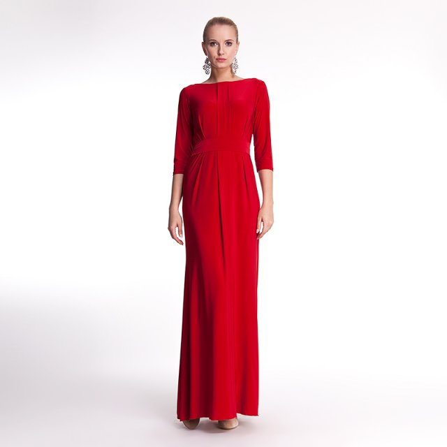 Suknia wieczorowa uszyta z ciemnoczerwonej dzianiny, na długiej podszewce.