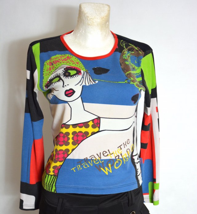 Kolorowa bluzka z nadrukiem niemieckiej marki wykonana z grubszej bawełny, przód cały wzorzysty, tył gładki czarny.